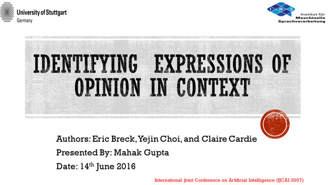 of Opinion in Context." IJCAI. Vol. 7. 2007. § Wilson, Theresa, JanyceWiebe, and Paul Hoffmann. "Recognizing contextual polarity in phrase-level sentiment analysis." Proceedings of the conference on human language technology and empirical methods in natural language processing. Association for Computational Linguistics, 2005. § Wiebe, Janyce, and Ellen Riloff. "Creating subjective and objective sentence classifiers from unannotated texts." Computational Linguistics and Intelligent Text Processing. Springer Berlin Heidelberg, 2005. 486-497. 13.06.16 23
