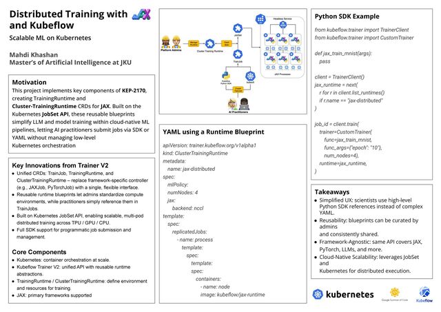 components of KEP-2170, creating TrainingRuntime and Cluster-TrainingRuntime CRDs for JAX. Built on the Kubernetes JobSet API, these reusable blueprints simplify LLM and model training within cloud-native ML pipelines, letting AI practitioners submit jobs via SDK or YAML without managing low-level Kubernetes orchestration Takeaways • Simplified UX: scientists use high-level Python SDK references instead of complex YAML. • Reusability: blueprints can be curated by admins and consistently shared. • Framework-Agnostic: same API covers JAX, PyTorch, LLMs, and more. • Cloud-Native Scalability: leverages JobSet and Kubernetes for distributed execution. Python SDK Example from kubeflow.trainer import TrainerClient from kubeflow.trainer import CustomTrainer def jax_train_mnist(args): pass client = TrainerClient() jax_runtime = next( r for r in client.list_runtimes() if r.name == "jax-distributed" ) job_id = client.train( trainer=CustomTrainer( func=jax_train_mnist, func_args={"epoch": "10"}, num_nodes=4), runtime=jax_runtime, ) YAML using a Runtime Blueprint apiVersion: trainer.kubeflow.org/v1alpha1 kind: ClusterTrainingRuntime metadata: name: jax-distributed spec: mlPolicy: numNodes: 4 jax: backend: nccl template: spec: replicatedJobs: - name: process template: spec: template: spec: containers: - name: node image: kubeflow/jax-runtime Key Innovations from Trainer V2 • Unified CRDs: TrainJob, TrainingRuntime, and ClusterTrainingRuntime – replace framework-specific controller (e.g., JAXJob, PyTorchJob) with a single, flexible interface. • Reusable runtime blueprints let admins standardize compute environments, while practitioners simply reference them in TrainJobs. • Built on Kubernetes JobSet API, enabling scalable, multi-pod distributed training across TPU / GPU / CPU. • Full SDK support for programmatic job submission and management. Core Components • Kubernetes: container orchestration at scale. • Kubeflow Trainer V2: unified API with reusable runtime abstractions. • TrainingRuntime / ClusterTrainingRuntime: define environment and resources for training. • JAX: primary frameworks supported Mahdi Khashan Master’s of Artificial Intelligence at JKU Scalable ML on Kubernetes