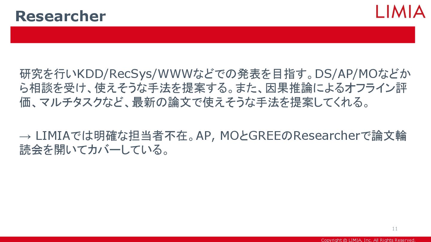 Copyright © LIMIA, Inc. All Rights Reserved. 研究を行いKDD/RecSys/WWWなどでの発表を目指す。DS/AP/MOなどか ら相談を受け、使えそうな手法を提案する。また、因果推論によるオフライン評 価、マルチタスクなど、最新の論文で使えそうな手法を提案してくれる。