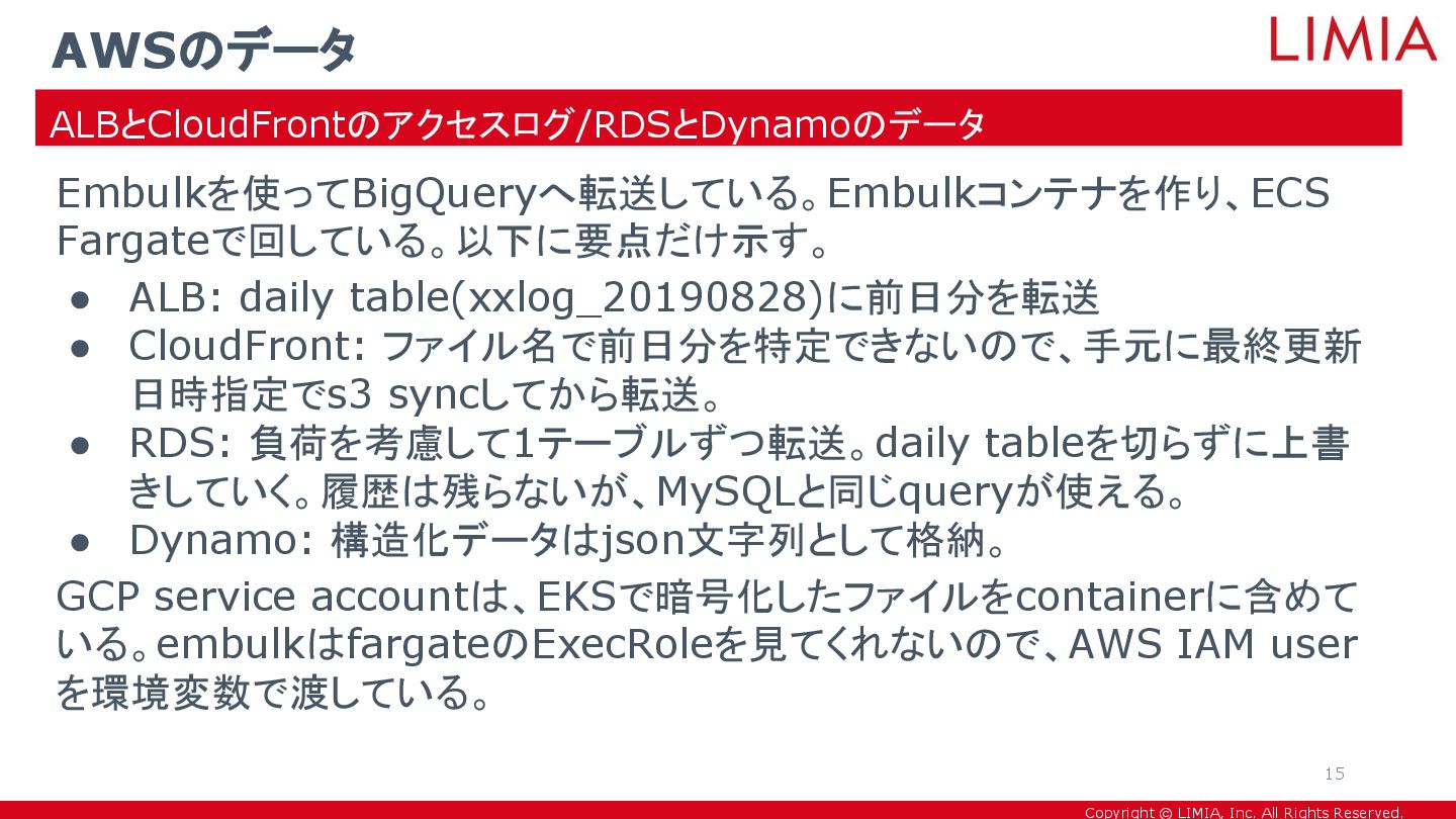 Copyright © LIMIA, Inc. All Rights Reserved. Embulkを使ってBigQueryへ転送している。Embulkコンテナを作り、ECS Fargateで回している。以下に要点だけ示す。 •