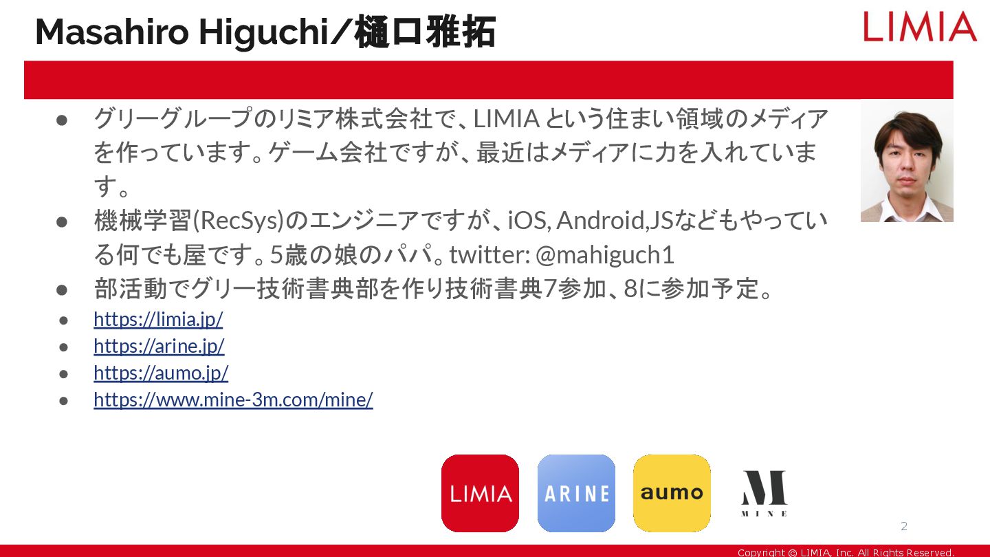 を作っています。ゲーム会社ですが、最近はメディアに力を入れていま す。 • 機械学習(RecSys)のエンジニアですが、iOS, Android,JSなどもやってい る何でも屋です。5歳の娘のパパ。twitter: @mahiguch1 • 部活動でグリー技術書典部を作り技術書典7参加、8に参加予定。 • https://limia.jp/ • https://arine.jp/ • https://aumo.jp/ • https://www.mine-3m.com/mine/ Masahiro Higuchi/樋口雅拓 2