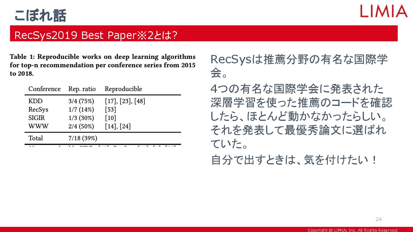 深層学習を使った推薦のコードを確認 したら、ほとんど動かなかったらしい。 それを発表して最優秀論文に選ばれ ていた。 自分で出すときは、気を付けたい! こぼれ話 RecSys2019 Best Paper※2とは? 24
