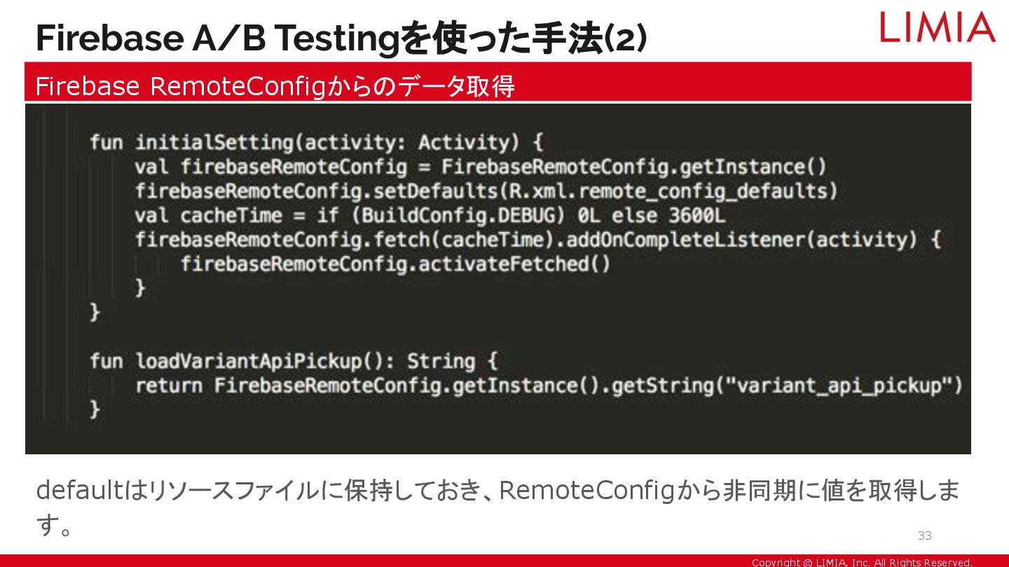Copyright © LIMIA, Inc. All Rights Reserved. defaultはリソースファイルに保持しておき、RemoteConfigから非同期に値を取得しま す。 Firebase