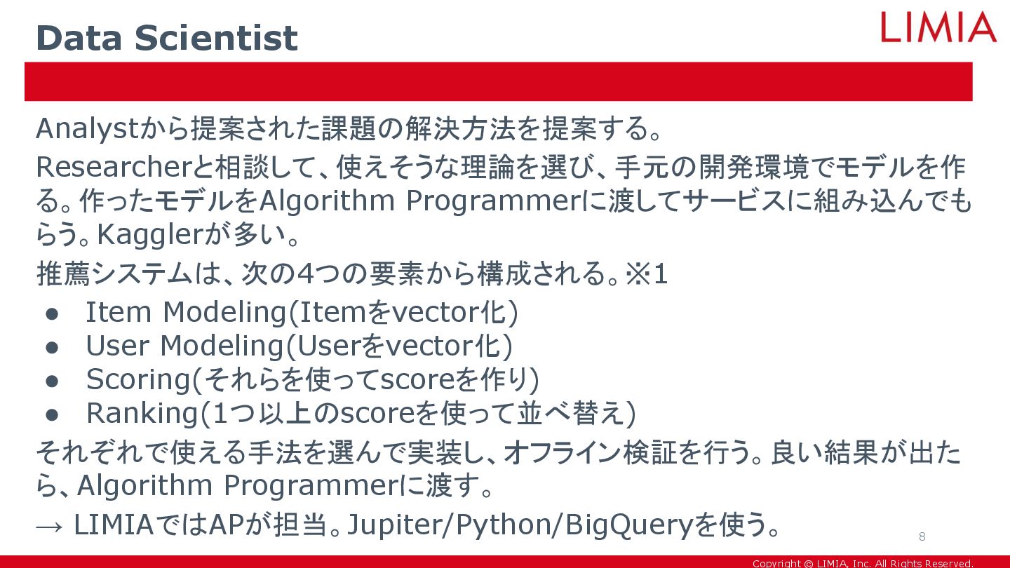 Programmerに渡してサービスに組み込んでも らう。Kagglerが多い。 推薦システムは、次の4つの要素から構成される。※1 • Item Modeling(Itemをvector化) • User Modeling(Userをvector化) • Scoring(それらを使ってscoreを作り) • Ranking(1つ以上のscoreを使って並べ替え) それぞれで使える手法を選んで実装し、オフライン検証を行う。良い結果が出た ら、Algorithm Programmerに渡す。 → LIMIAではAPが担当。Jupiter/Python/BigQueryを使う。 Data Scientist 8
