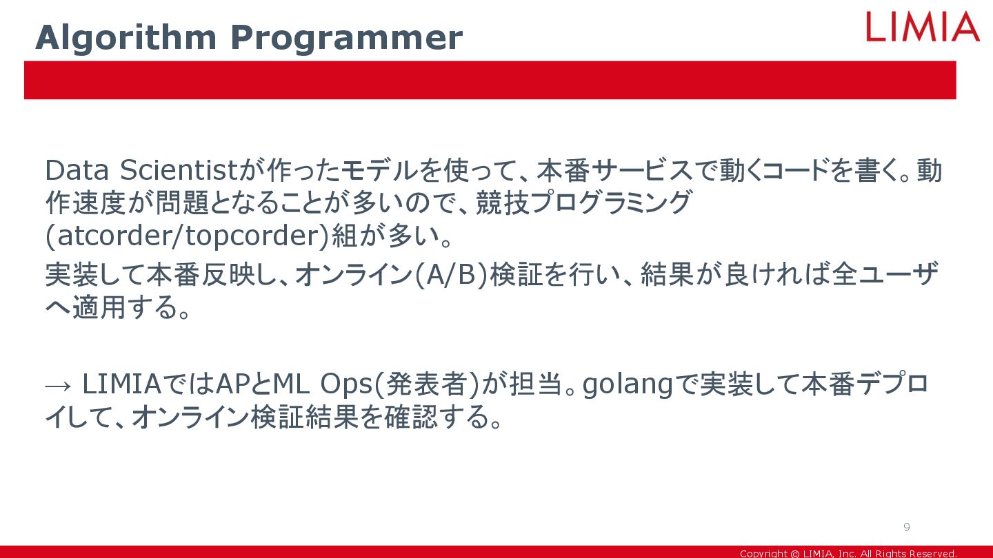 (atcorder/topcorder)組が多い。 実装して本番反映し、オンライン(A/B)検証を行い、結果が良ければ全ユーザ へ適用する。 → LIMIAではAPとML Ops(発表者)が担当。golangで実装して本番デプロ イして、オンライン検証結果を確認する。 Algorithm Programmer 9