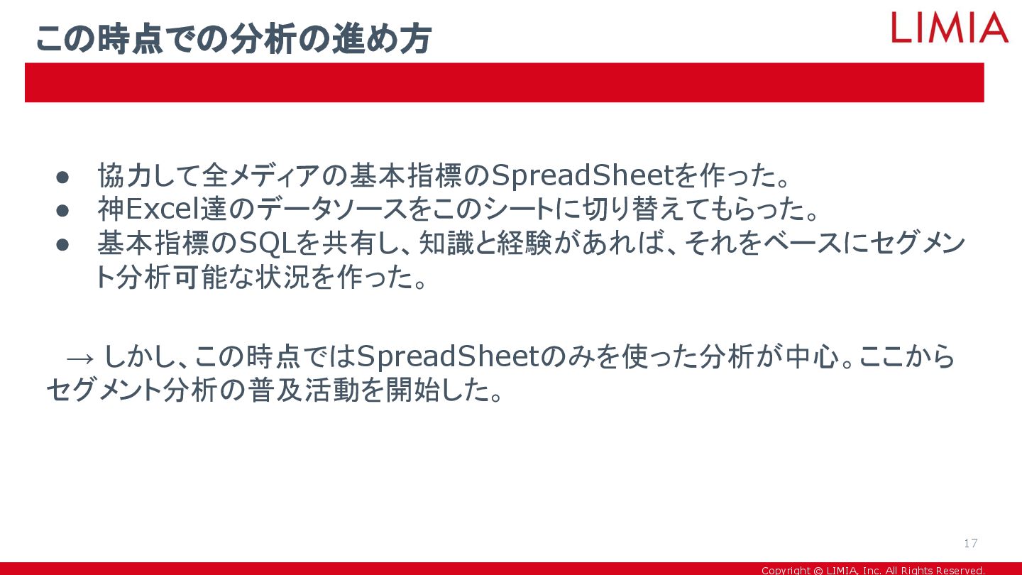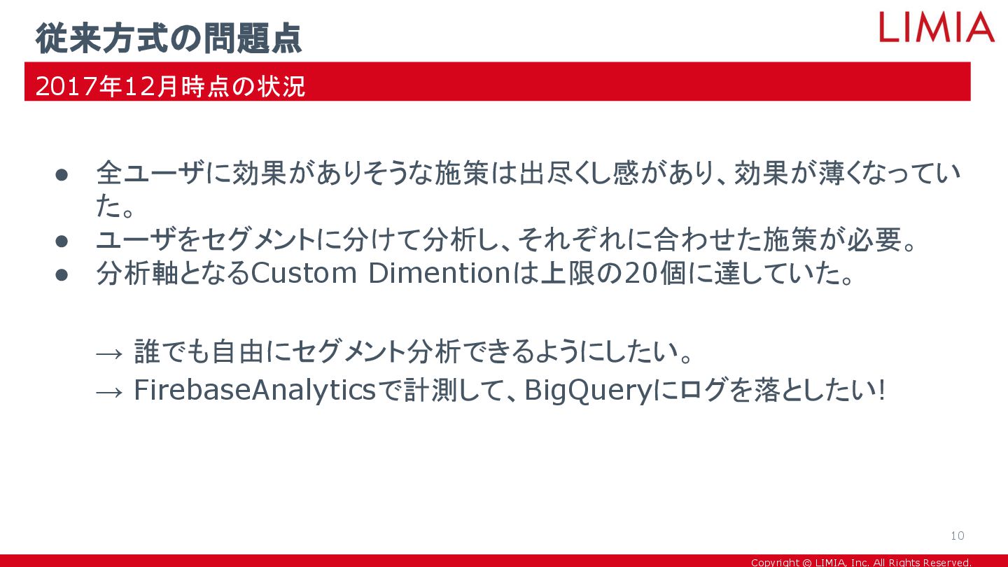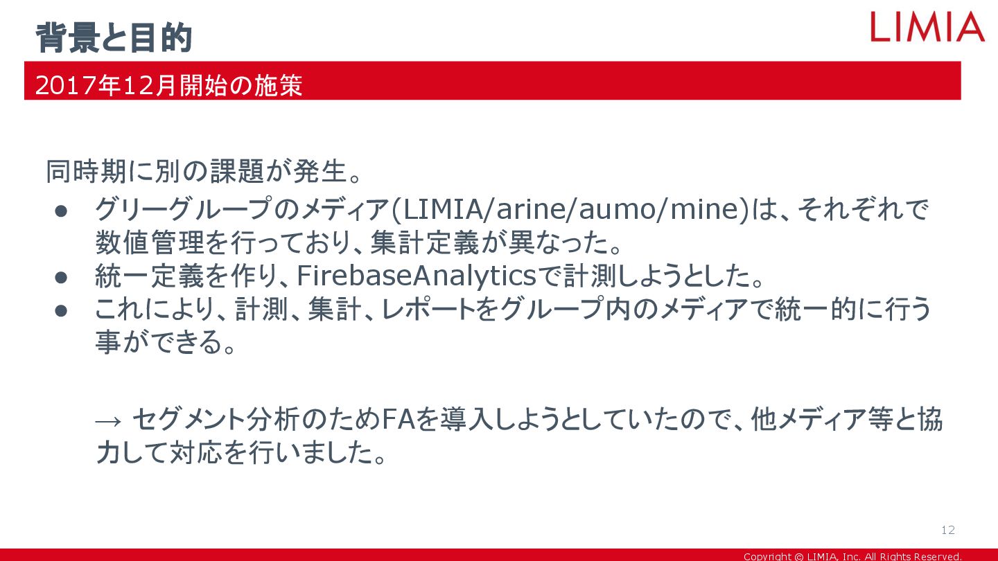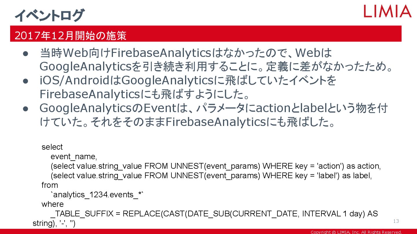 • iOS/AndroidはGoogleAnalyticsに飛ばしていたイベントを FirebaseAnalyticsにも飛ばすようにした。 • GoogleAnalyticsのEventは、パラメータにactionとlabelという物を付 けていた。それをそのままFirebaseAnalyticsにも飛ばした。 イベントログ 2017年12月開始の施策 13 select event_name, (select value.string_value FROM UNNEST(event_params) WHERE key = 'action') as action, (select value.string_value FROM UNNEST(event_params) WHERE key = 'label') as label, from `analytics_1234.events_*` where _TABLE_SUFFIX = REPLACE(CAST(DATE_SUB(CURRENT_DATE, INTERVAL 1 day) AS string), '-', '')