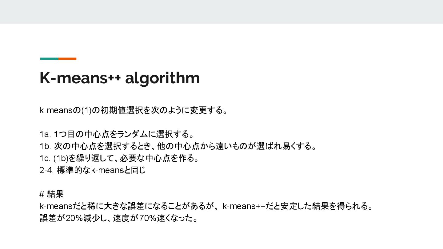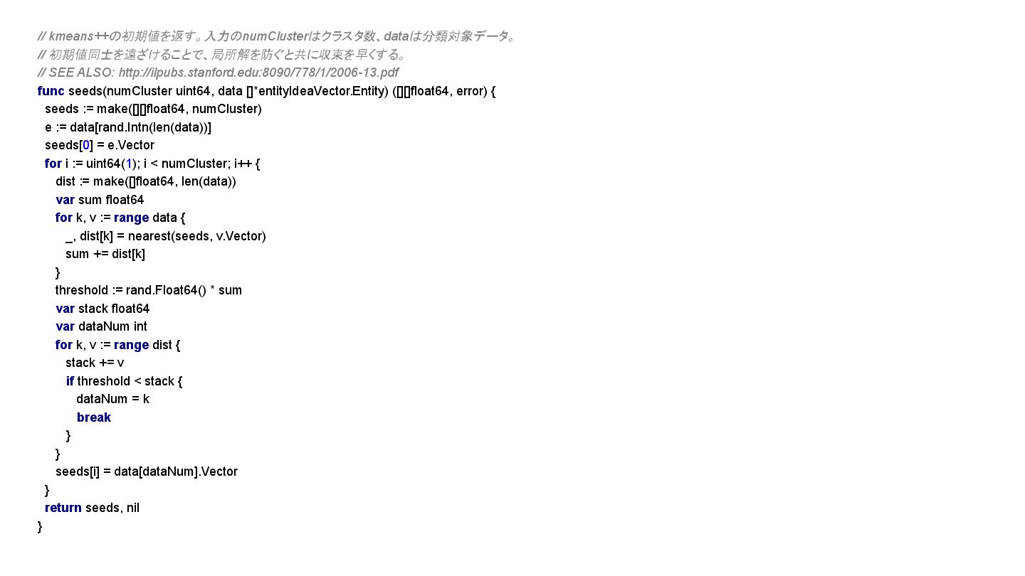 uint64, data []*entityIdeaVector.Entity) ([][]float64, error) { seeds := make([][]float64, numCluster) e := data[rand.Intn(len(data))] seeds[0] = e.Vector for i := uint64(1); i < numCluster; i++ { dist := make([]float64, len(data)) var sum float64 for k, v := range data { _, dist[k] = nearest(seeds, v.Vector) sum += dist[k] } threshold := rand.Float64() * sum var stack float64 var dataNum int for k, v := range dist { stack += v if threshold < stack { dataNum = k break } } seeds[i] = data[dataNum].Vector } return seeds, nil }