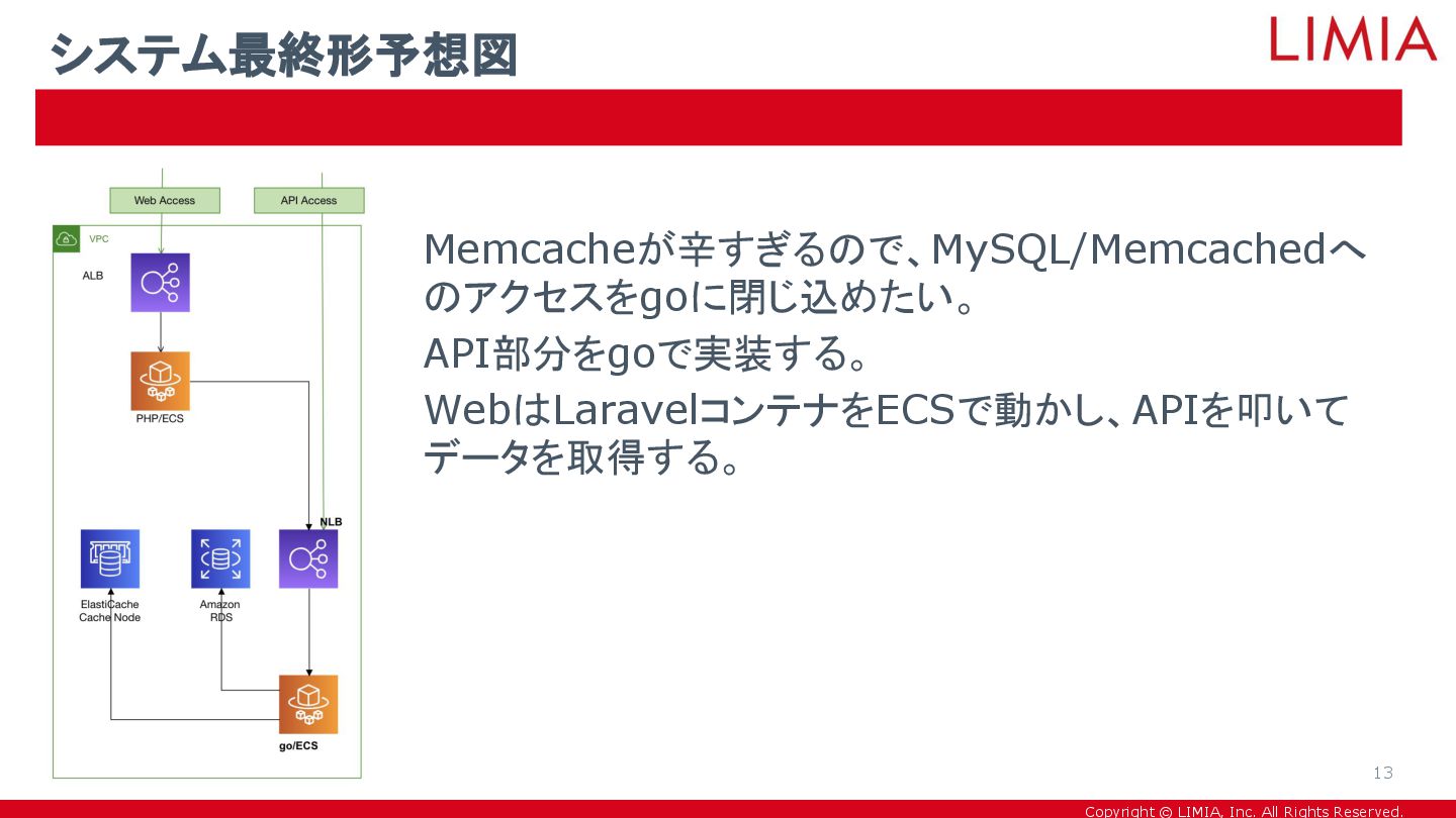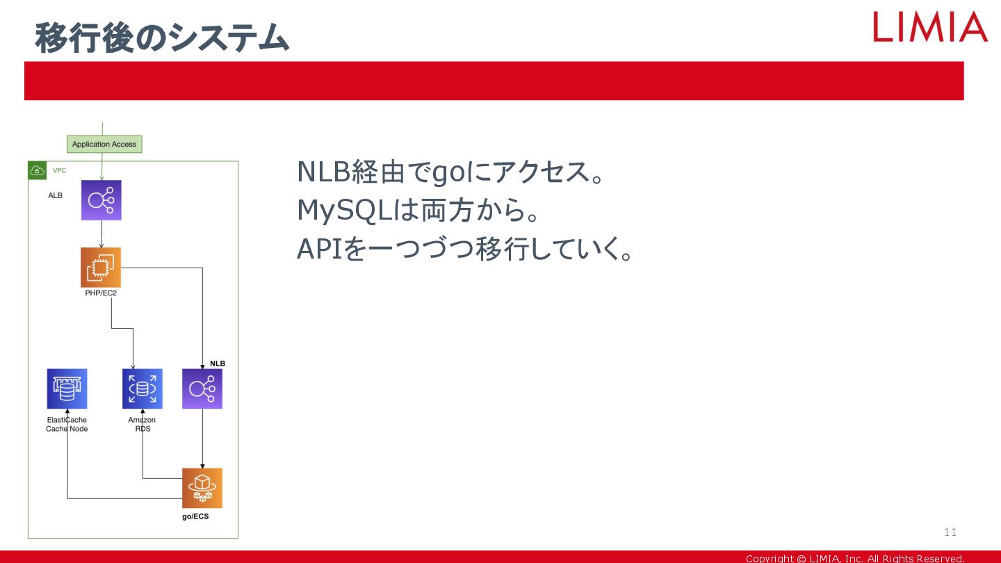 Copyright © LIMIA, Inc. All Rights Reserved. NLB経由でgoにアクセス。 MySQLは両方から。 APIを一つづつ移行していく。