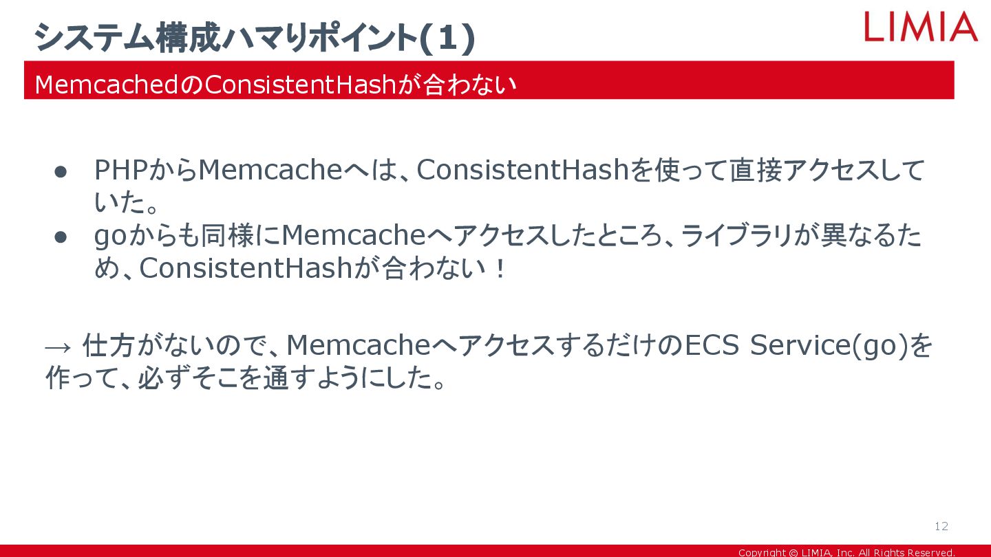 • goからも同様にMemcacheへアクセスしたところ、ライブラリが異なるた め、ConsistentHashが合わない! → 仕方がないので、MemcacheへアクセスするだけのECS Service(go)を 作って、必ずそこを通すようにした。 システム構成ハマりポイント(1) MemcachedのConsistentHashが合わない 12