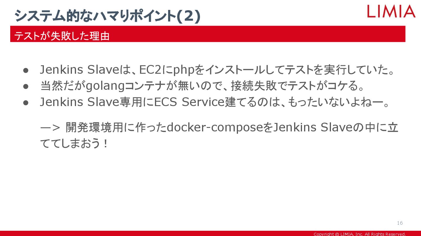 • 当然だがgolangコンテナが無いので、接続失敗でテストがコケる。 • Jenkins Slave専用にECS Service建てるのは、もったいないよねー。 —> 開発環境用に作ったdocker-composeをJenkins Slaveの中に立 ててしまおう! システム的なハマりポイント(2) テストが失敗した理由 16