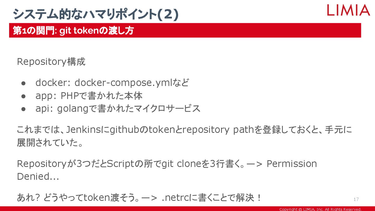 docker-compose.ymlなど • app: PHPで書かれた本体 • api: golangで書かれたマイクロサービス これまでは、Jenkinsにgithubのtokenとrepository pathを登録しておくと、手元に 展開されていた。 Repositoryが3つだとScriptの所でgit cloneを3行書く。—> Permission Denied... あれ? どうやってtoken渡そう。—> .netrcに書くことで解決! システム的なハマりポイント(2) 第1の関門: git tokenの渡し方 17