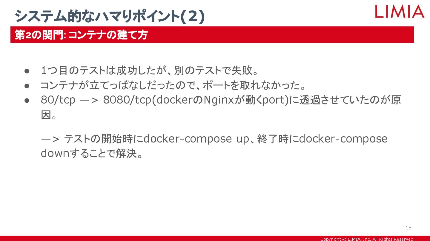 コンテナが立てっぱなしだったので、ポートを取れなかった。 • 80/tcp —> 8080/tcp(dockerのNginxが動くport)に透過させていたのが原 因。 —> テストの開始時にdocker-compose up、終了時にdocker-compose downすることで解決。 システム的なハマりポイント(2) 第2の関門: コンテナの建て方 18