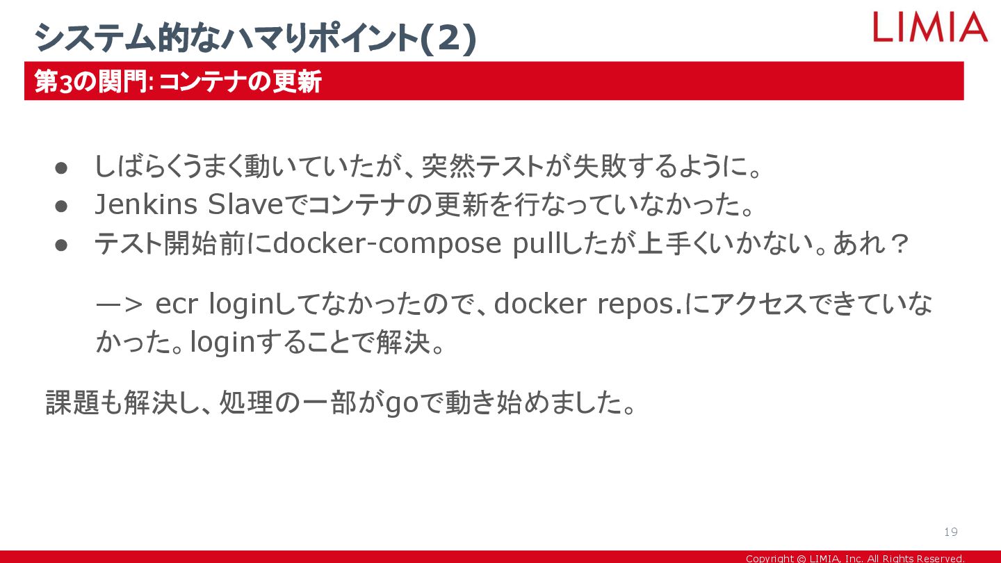 Jenkins Slaveでコンテナの更新を行なっていなかった。 • テスト開始前にdocker-compose pullしたが上手くいかない。あれ? —> ecr loginしてなかったので、docker repos.にアクセスできていな かった。loginすることで解決。 課題も解決し、処理の一部がgoで動き始めました。 システム的なハマりポイント(2) 第3の関門: コンテナの更新 19