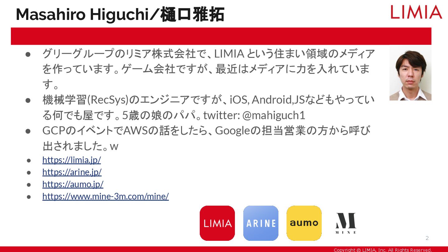 を作っています。ゲーム会社ですが、最近はメディアに力を入れていま す。 • 機械学習(RecSys)のエンジニアですが、iOS, Android,JSなどもやってい る何でも屋です。5歳の娘のパパ。twitter: @mahiguch1 • GCPのイベントでAWSの話をしたら、Googleの担当営業の方から呼び 出されました。w • https://limia.jp/ • https://arine.jp/ • https://aumo.jp/ • https://www.mine-3m.com/mine/ Masahiro Higuchi/樋口雅拓 2