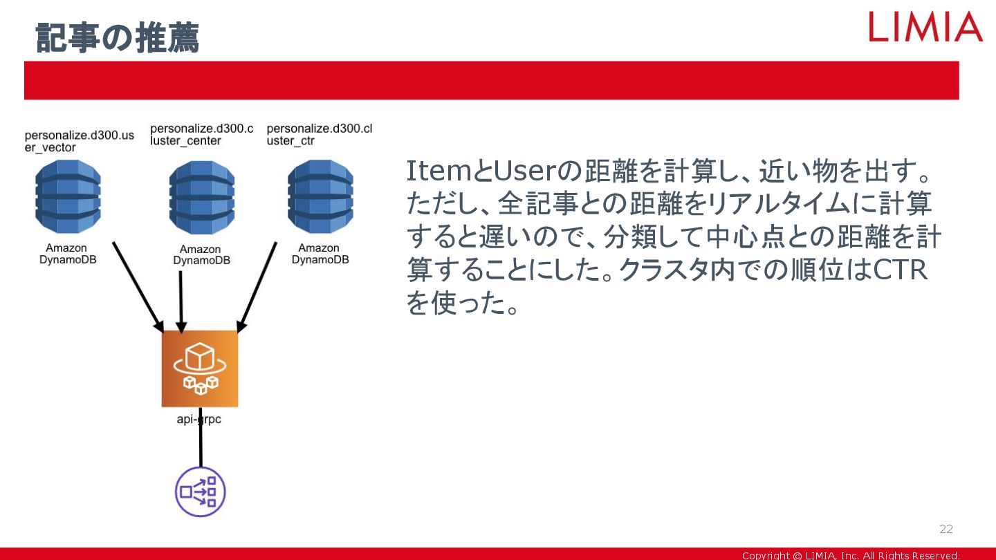 Copyright © LIMIA, Inc. All Rights Reserved. ItemとUserの距離を計算し、近い物を出す。 ただし、全記事との距離をリアルタイムに計算 すると遅いので、分類して中心点との距離を計