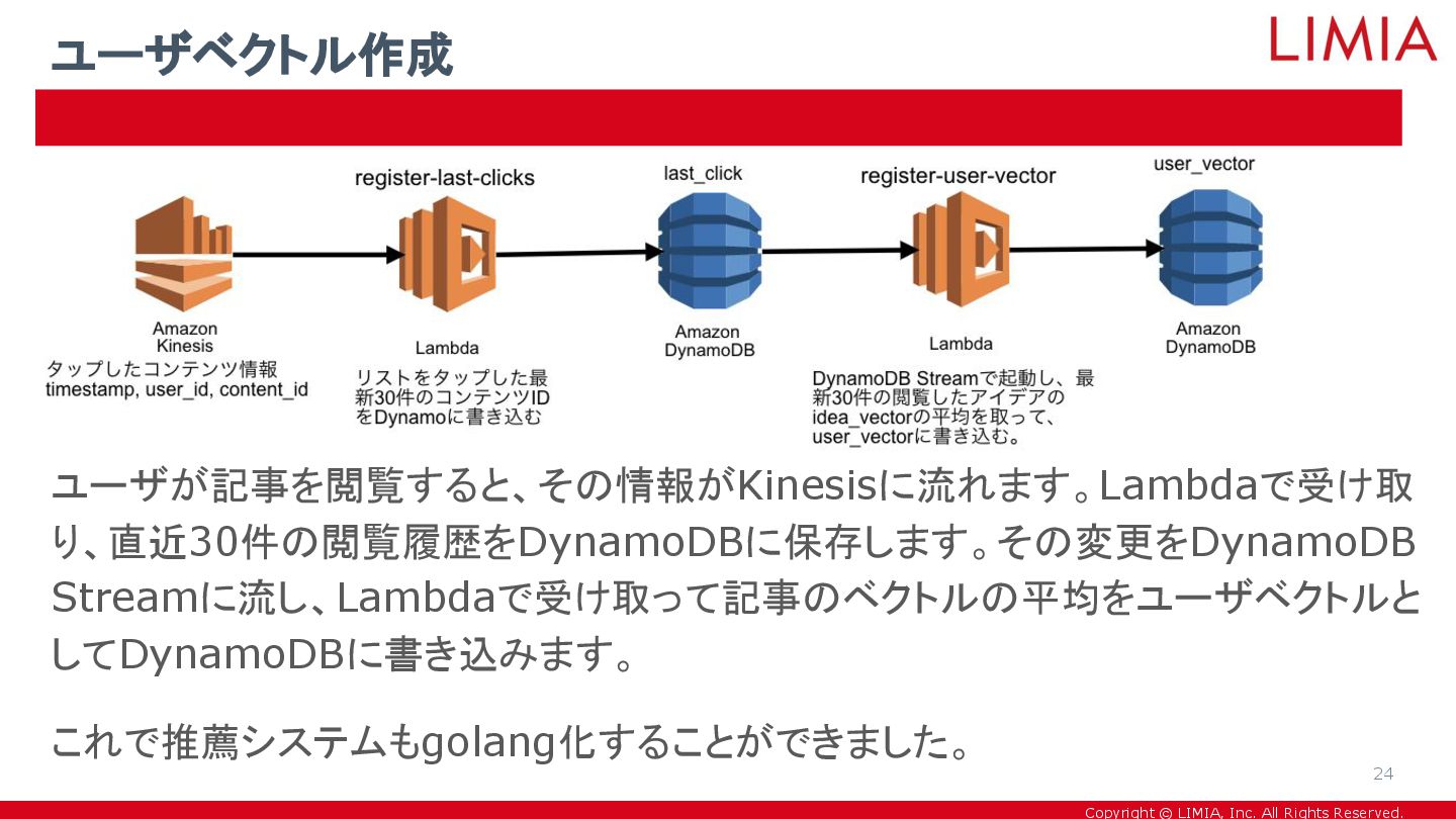 Copyright © LIMIA, Inc. All Rights Reserved. ユーザが記事を閲覧すると、その情報がKinesisに流れます。Lambdaで受け取 り、直近30件の閲覧履歴をDynamoDBに保存します。その変更をDynamoDB Streamに流し、Lambdaで受け取って記事のベクトルの平均をユーザベクトルと