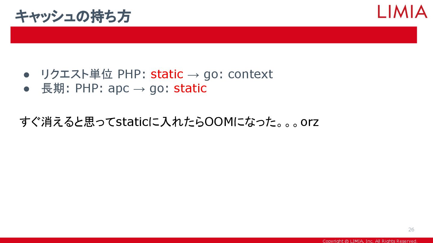 static → go: context • 長期: PHP: apc → go: static すぐ消えると思ってstaticに入れたらOOMになった。。。orz キャッシュの持ち方 26