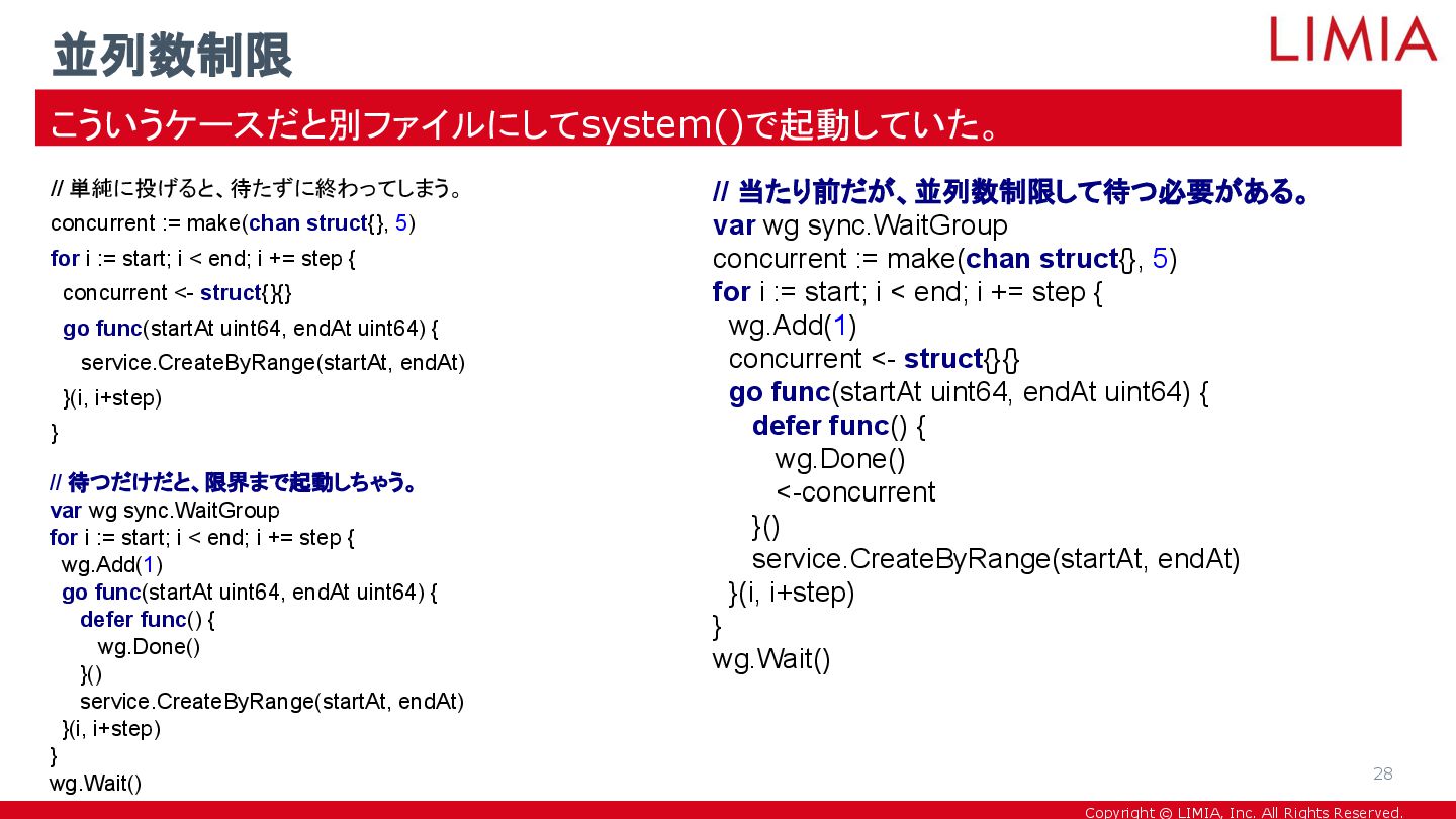:= make(chan struct{}, 5) for i := start; i < end; i += step { concurrent <- struct{}{} go func(startAt uint64, endAt uint64) { service.CreateByRange(startAt, endAt) }(i, i+step) } 並列数制限 こういうケースだと別ファイルにしてsystem()で起動していた。 28 // 当たり前だが、並列数制限して待つ必要がある。 var wg sync.WaitGroup concurrent := make(chan struct{}, 5) for i := start; i < end; i += step { wg.Add(1) concurrent <- struct{}{} go func(startAt uint64, endAt uint64) { defer func() { wg.Done() <-concurrent }() service.CreateByRange(startAt, endAt) }(i, i+step) } wg.Wait() // 待つだけだと、限界まで起動しちゃう。 var wg sync.WaitGroup for i := start; i < end; i += step { wg.Add(1) go func(startAt uint64, endAt uint64) { defer func() { wg.Done() }() service.CreateByRange(startAt, endAt) }(i, i+step) } wg.Wait()