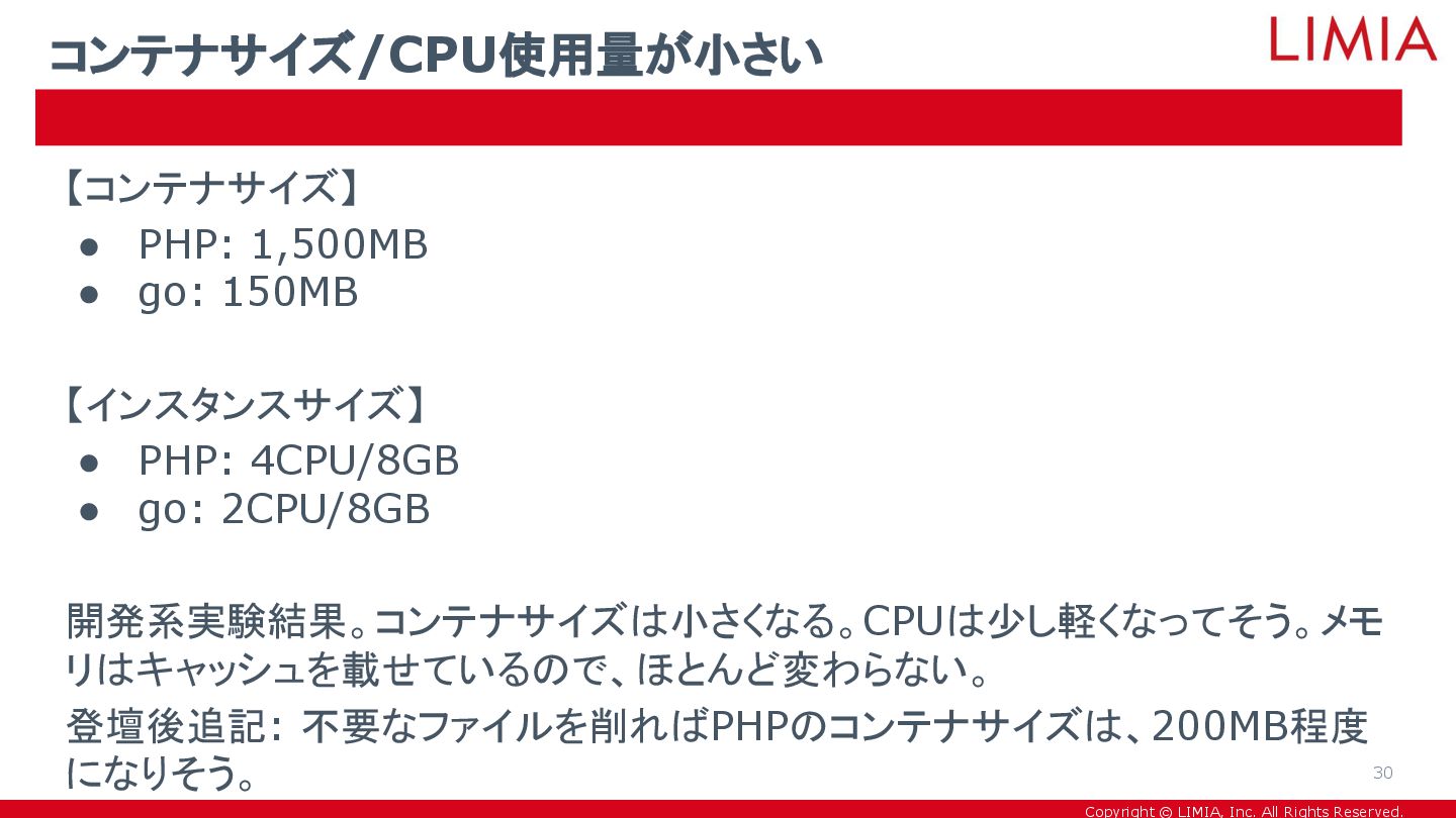 1,500MB • go: 150MB 【インスタンスサイズ】 • PHP: 4CPU/8GB • go: 2CPU/8GB 開発系実験結果。コンテナサイズは小さくなる。CPUは少し軽くなってそう。メモ リはキャッシュを載せているので、ほとんど変わらない。 登壇後追記: 不要なファイルを削ればPHPのコンテナサイズは、200MB程度 になりそう。 コンテナサイズ/CPU使用量が小さい 30