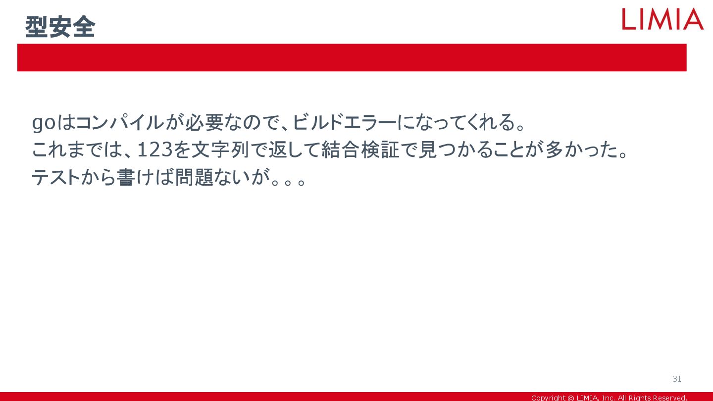 Copyright © LIMIA, Inc. All Rights Reserved. goはコンパイルが必要なので、ビルドエラーになってくれる。 これまでは、123を文字列で返して結合検証で見つかることが多かった。 テストから書けば問題ないが。。。