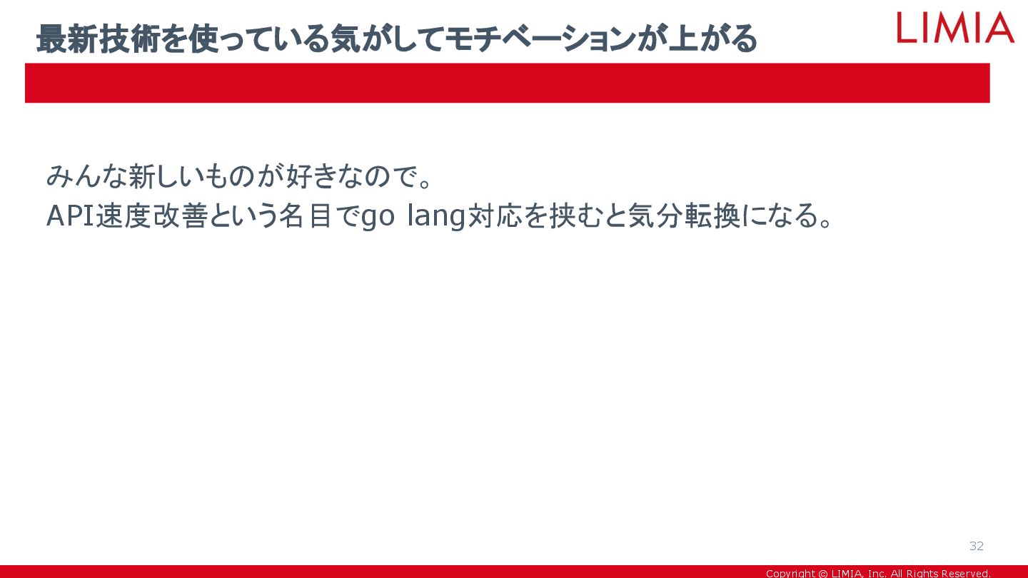Copyright © LIMIA, Inc. All Rights Reserved. みんな新しいものが好きなので。 API速度改善という名目でgo lang対応を挟むと気分転換になる。