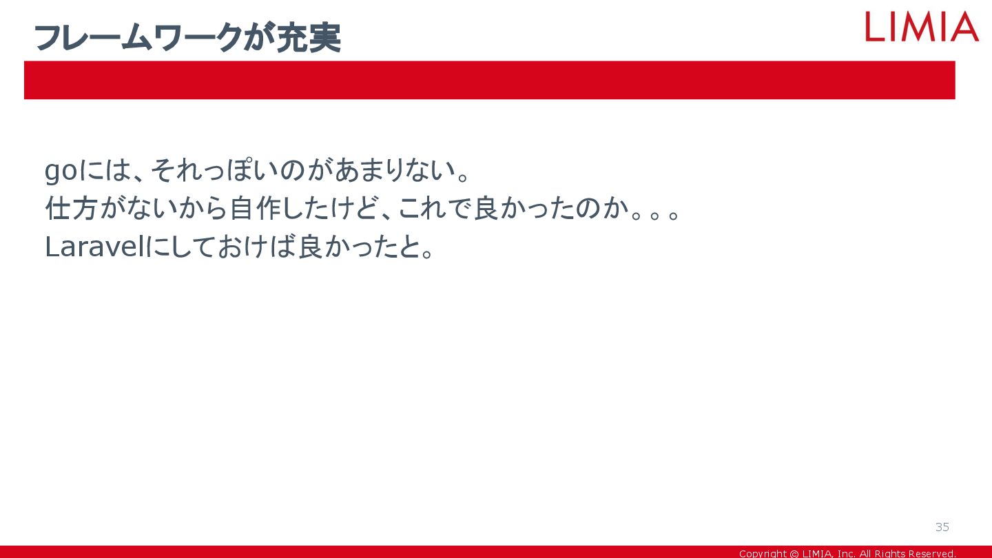 Copyright © LIMIA, Inc. All Rights Reserved. goには、それっぽいのがあまりない。 仕方がないから自作したけど、これで良かったのか。。。 Laravelにしておけば良かったと。