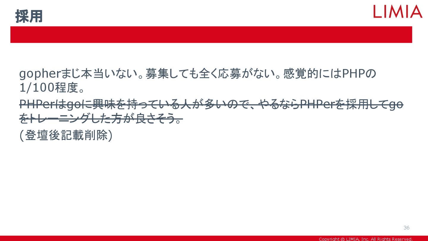 Copyright © LIMIA, Inc. All Rights Reserved. gopherまじ本当いない。募集しても全く応募がない。感覚的にはPHPの 1/100程度。 PHPerはgoに興味を持っている人が多いので、やるならPHPerを採用してgo