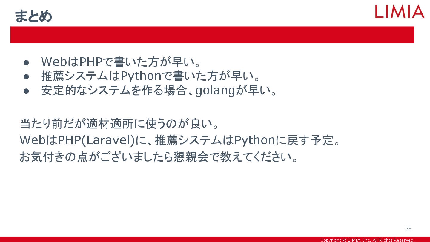 推薦システムはPythonで書いた方が早い。 • 安定的なシステムを作る場合、golangが早い。 当たり前だが適材適所に使うのが良い。 WebはPHP(Laravel)に、推薦システムはPythonに戻す予定。 お気付きの点がございましたら懇親会で教えてください。 まとめ 38