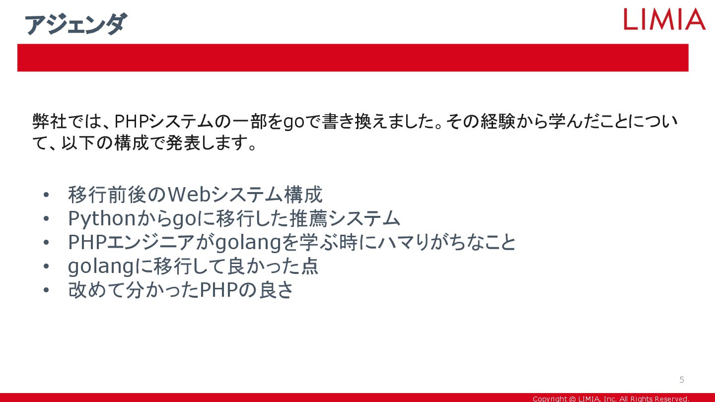 Copyright © LIMIA, Inc. All Rights Reserved. 弊社では、PHPシステムの一部をgoで書き換えました。その経験から学んだことについ て、以下の構成で発表します。 •