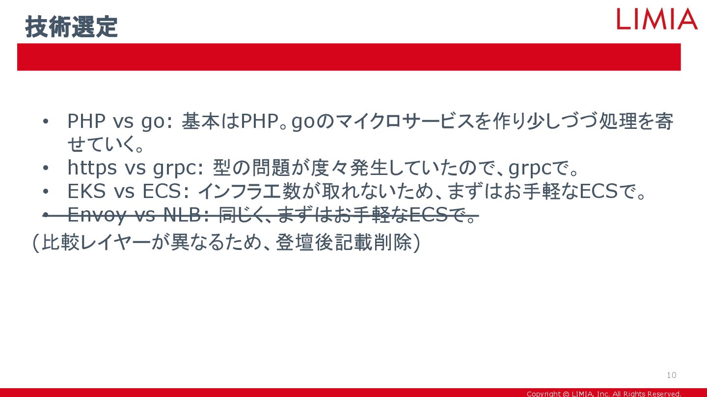 go: 基本はPHP。goのマイクロサービスを作り少しづづ処理を寄 せていく。 • https vs grpc: 型の問題が度々発生していたので、grpcで。 • EKS vs ECS: インフラ工数が取れないため、まずはお手軽なECSで。 • Envoy vs NLB: 同じく、まずはお手軽なECSで。 (比較レイヤーが異なるため、登壇後記載削除) 技術選定 10