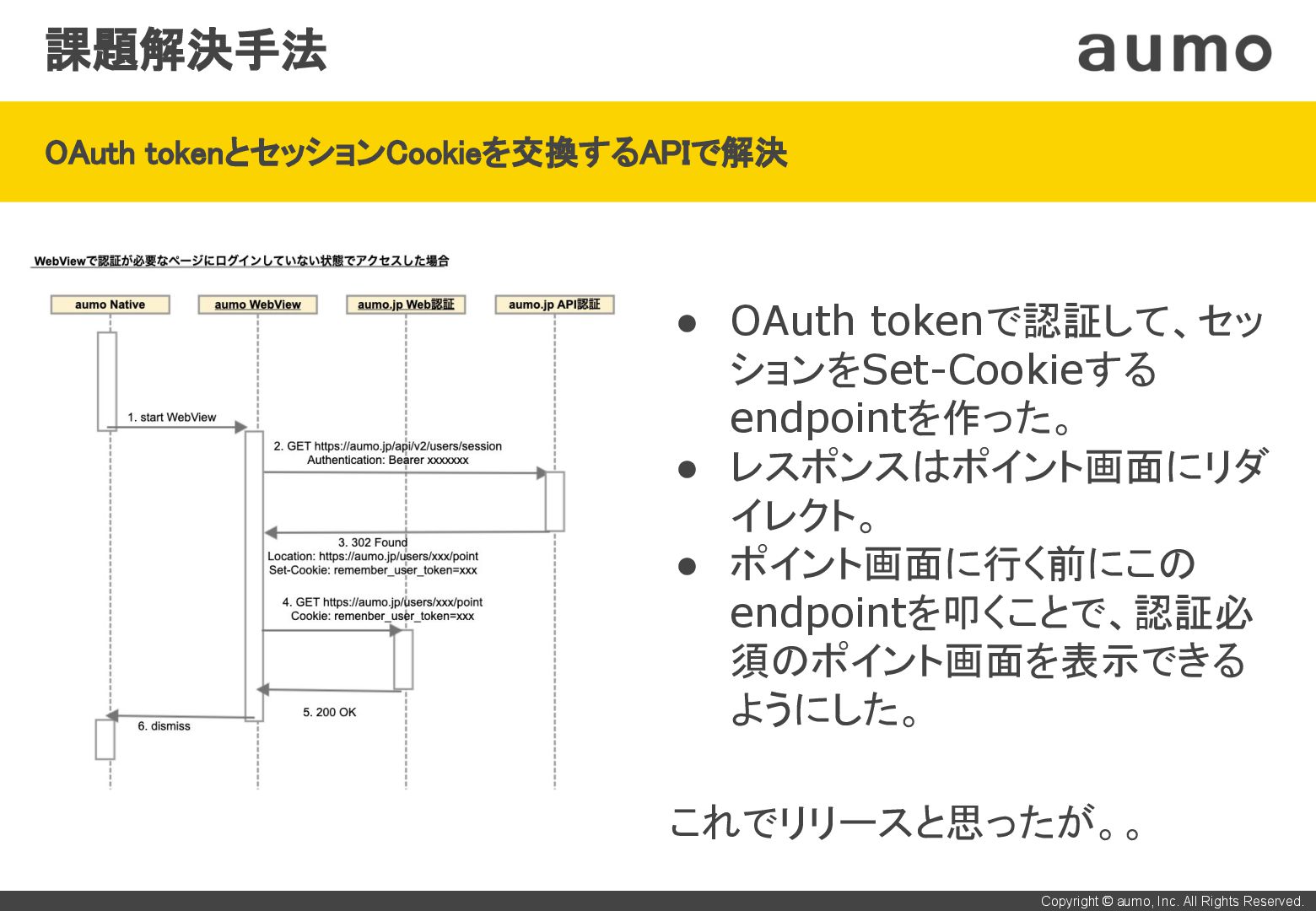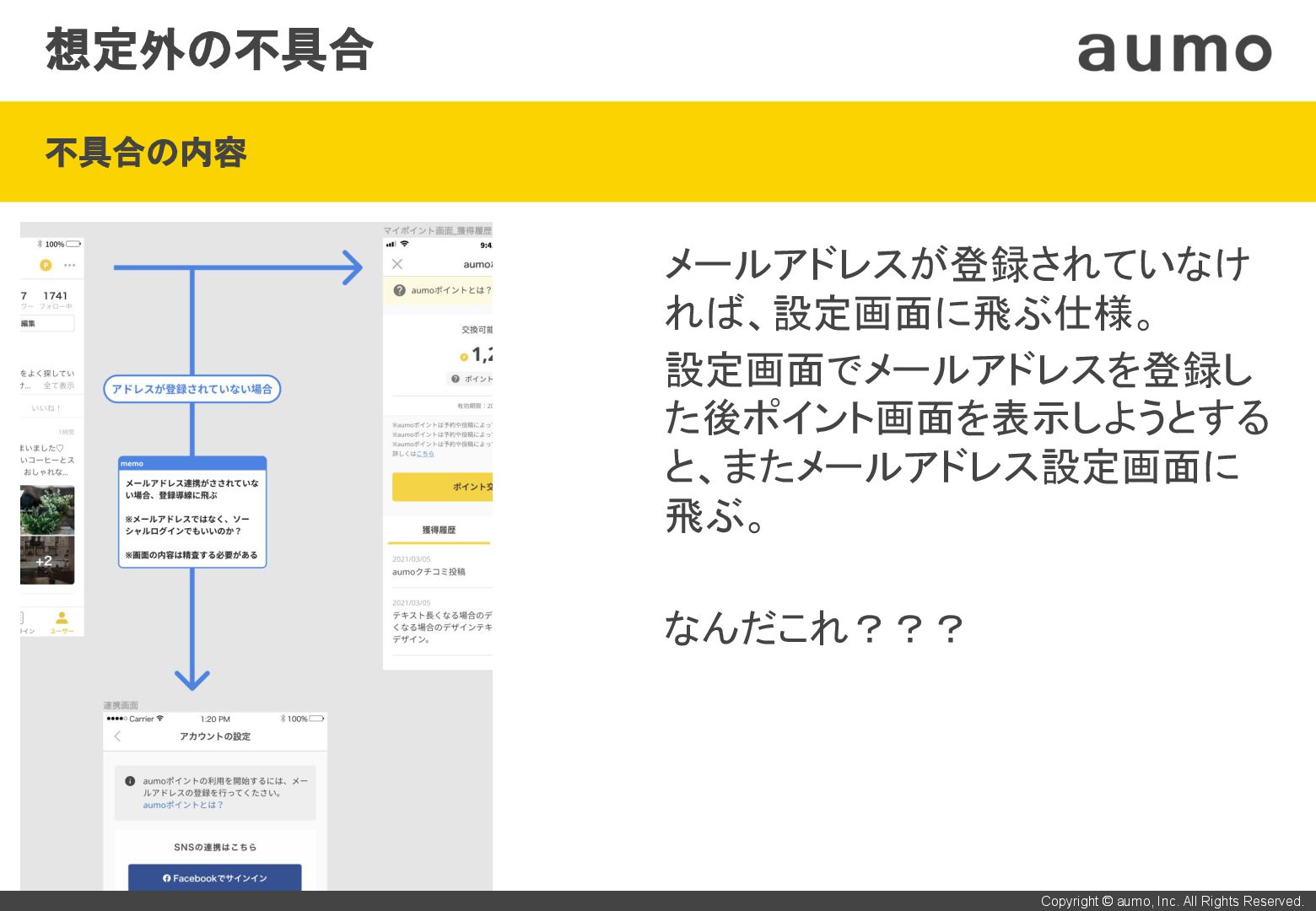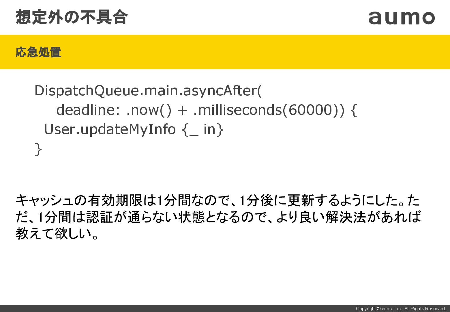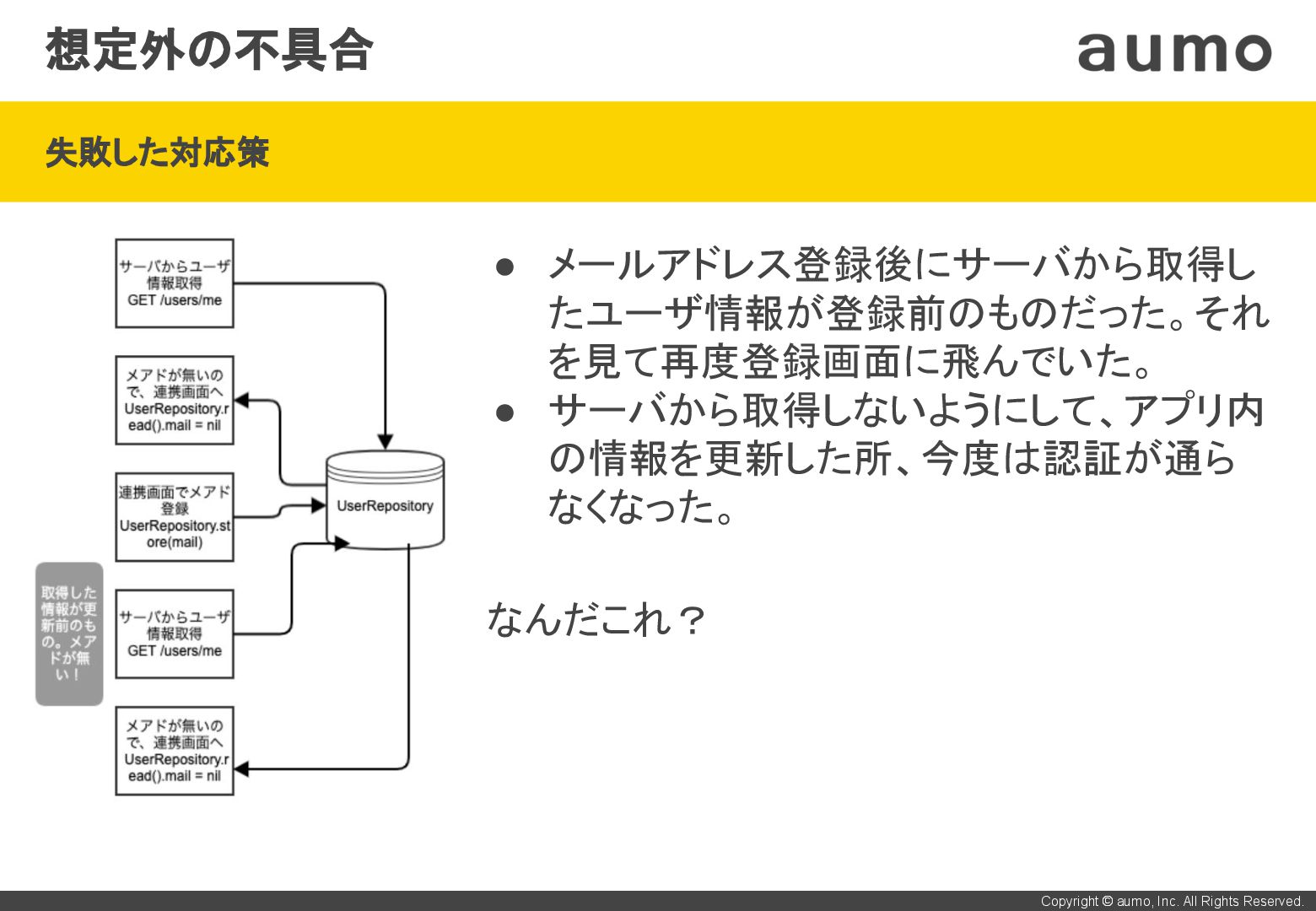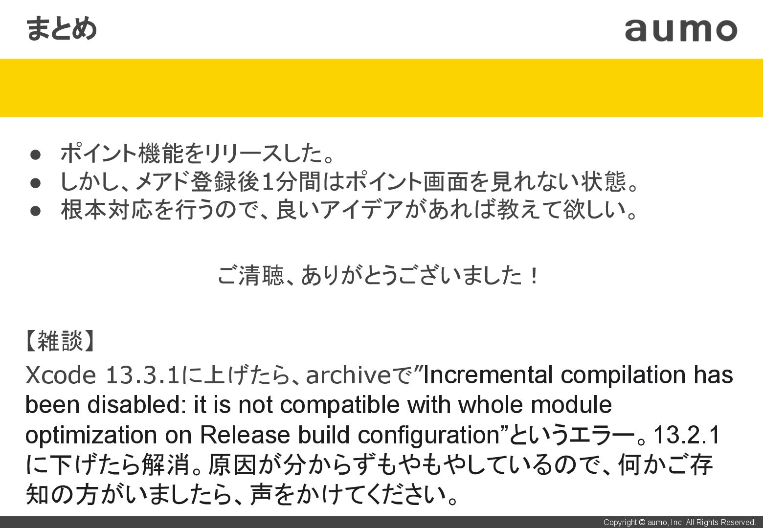 • しかし、メアド登録後1分間はポイント画面を見れない状態。 • 根本対応を行うので、良いアイデアがあれば教えて欲しい。 ご清聴、ありがとうございました! 【雑談】 Xcode 13.3.1に上げたら、archiveで”Incremental compilation has been disabled: it is not compatible with whole module optimization on Release build configuration”というエラー。13.2.1 に下げたら解消。原因が分からずもやもやしているので、何かご存 知の方がいましたら、声をかけてください。