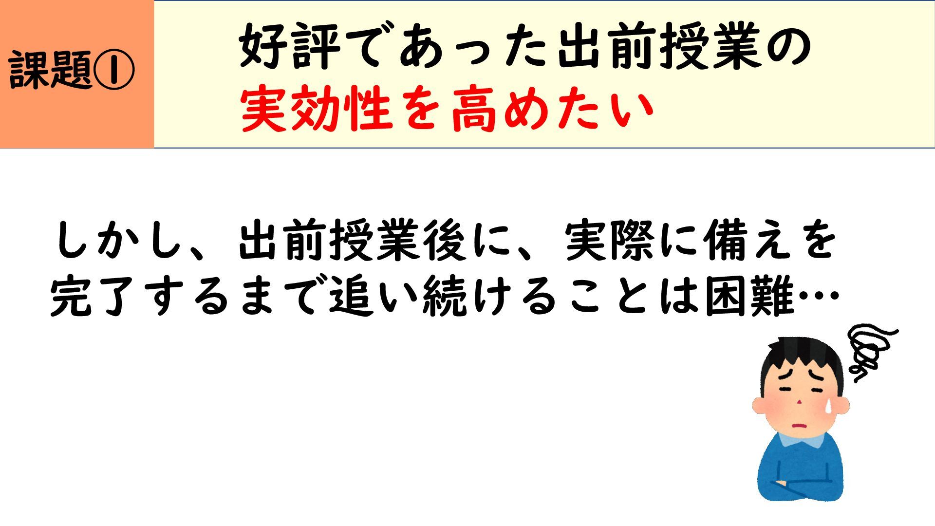 好評であった出前授業の 実効性を高めたい しかし、出前授業後に、実際に備えを 完了するまで追い続けることは困難… 課題①