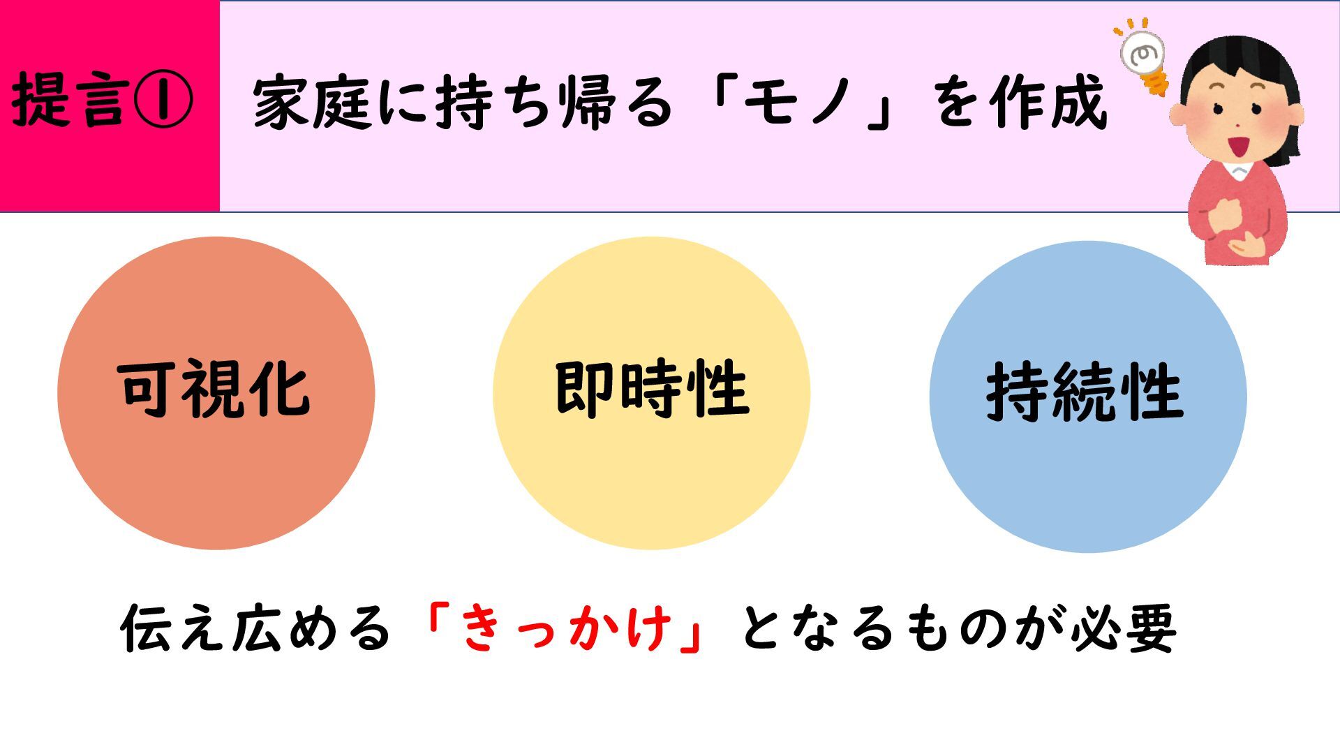 家庭に持ち帰る「モノ」を作成 可視化 持続性 即時性 伝え広める「きっかけ」となるものが必要 提言①