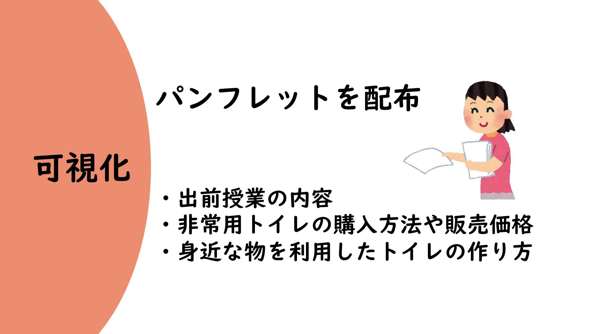 可視化 パンフレットを配布 ・出前授業の内容 ・非常用トイレの購入方法や販売価格 ・身近な物を利用したトイレの作り方