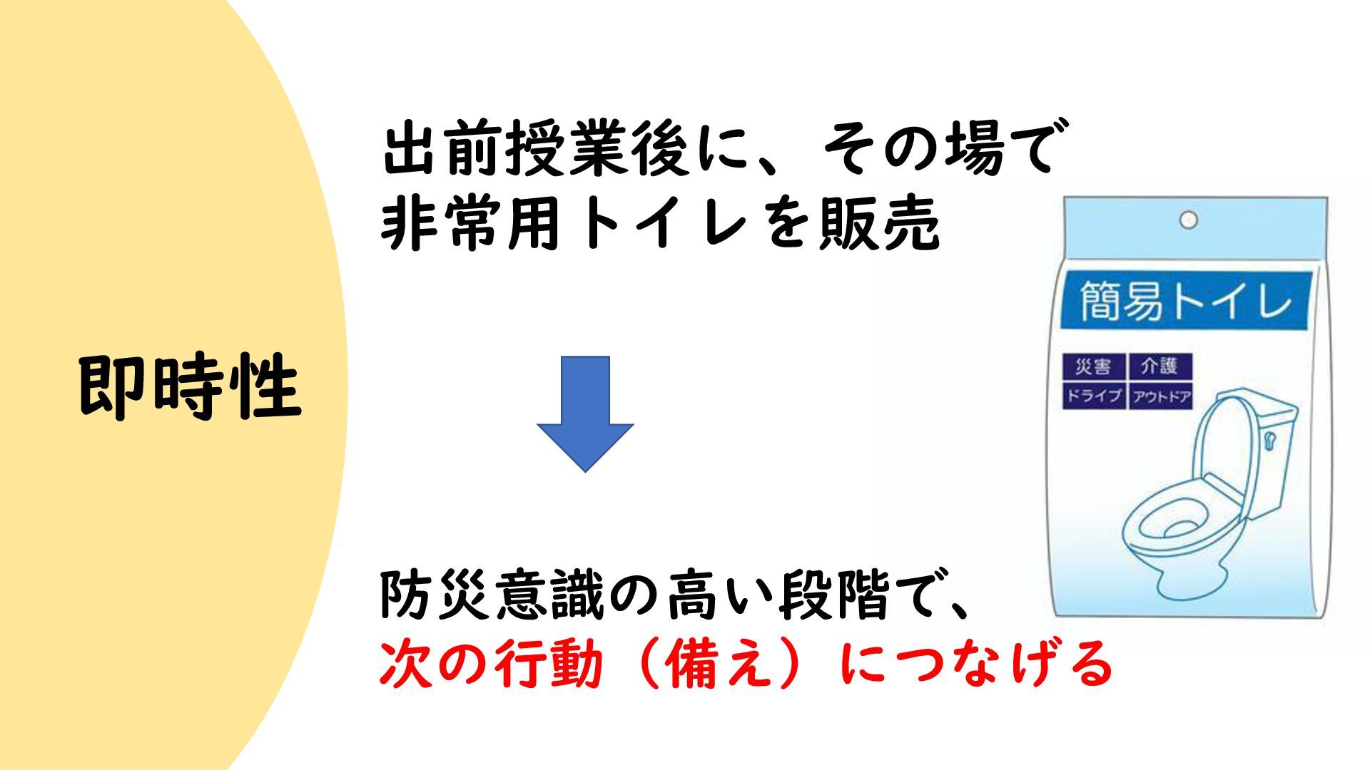 即時性 出前授業後に、その場で 非常用トイレを販売 防災意識の高い段階で、 次の行動(備え)につなげる