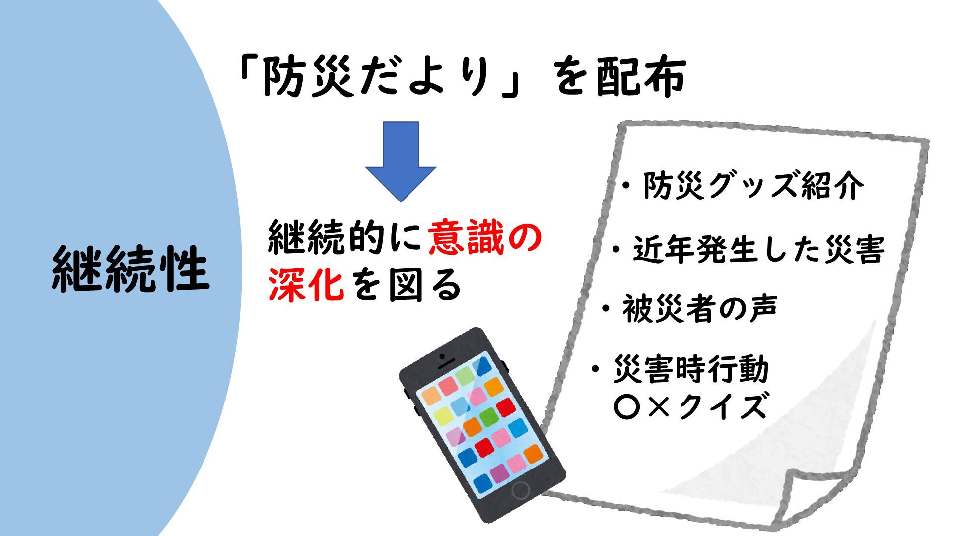 継続性 継続的に意識の 深化を図る 「防災だより」を配布 ・被災者の声 ・防災グッズ紹介 ・近年発生した災害 ・災害時行動 〇×クイズ