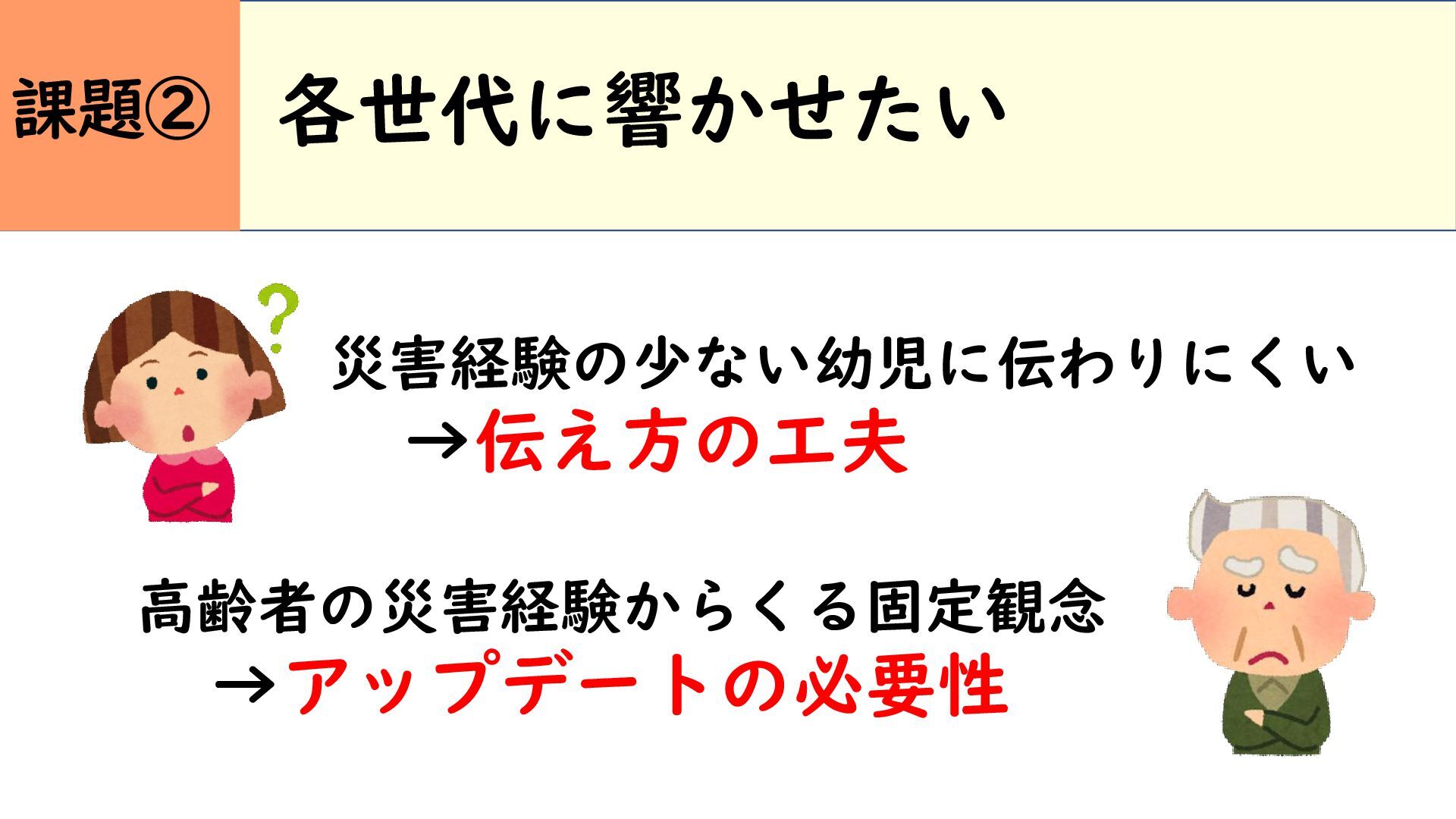 各世代に響かせたい 高齢者の災害経験からくる固定観念 →アップデートの必要性 災害経験の少ない幼児に伝わりにくい →伝え方の工夫 課題②