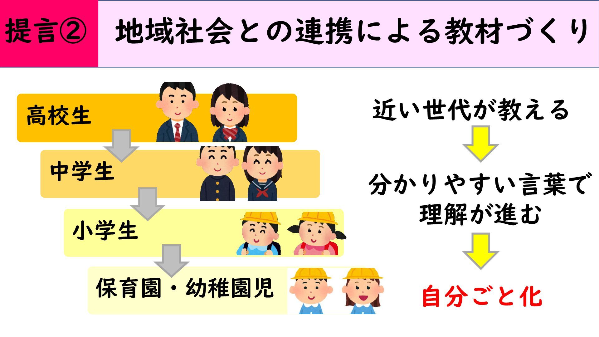 地域社会との連携による教材づくり 高校生 中学生 小学生 保育園・幼稚園児 近い世代が教える 分かりやすい言葉で 理解が進む 自分ごと化 提言②