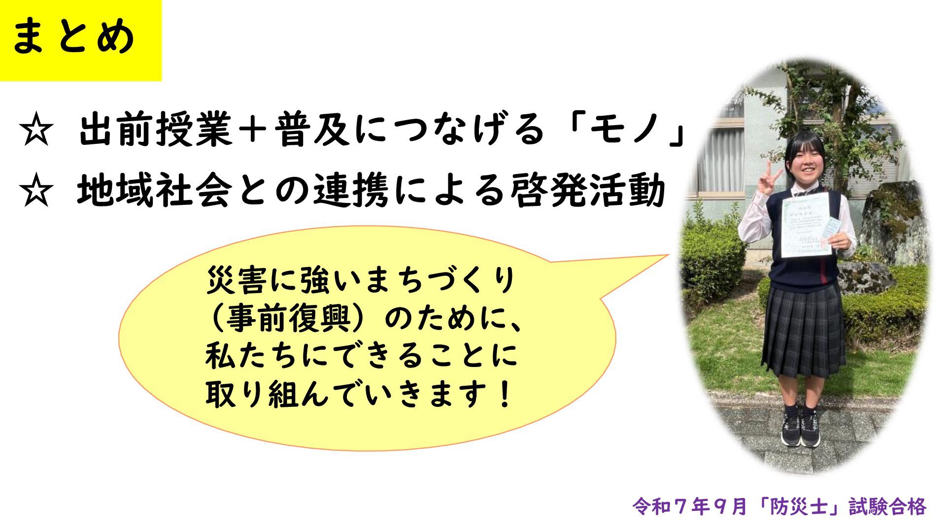 ☆ 出前授業+普及につなげる「モノ」 ☆ 地域社会との連携による啓発活動 災害に強いまちづくり (事前復興)のために、 私たちにできることに 取り組んでいきます! 令和7年9月「防災士」試験合格 まとめ