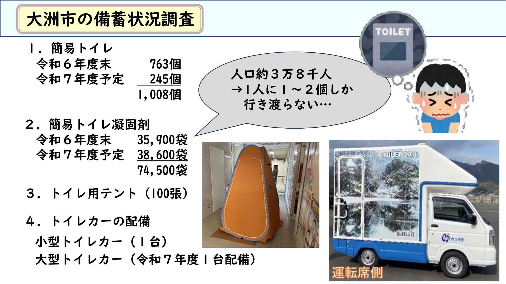 令和6年度末 35,900袋 令和7年度予定 38,600袋 74,500袋 大洲市の備蓄状況調査 大型トイレカー(令和7年度1台配備) 人口約3万8千人 →1人に1~2個しか 行き渡らない…