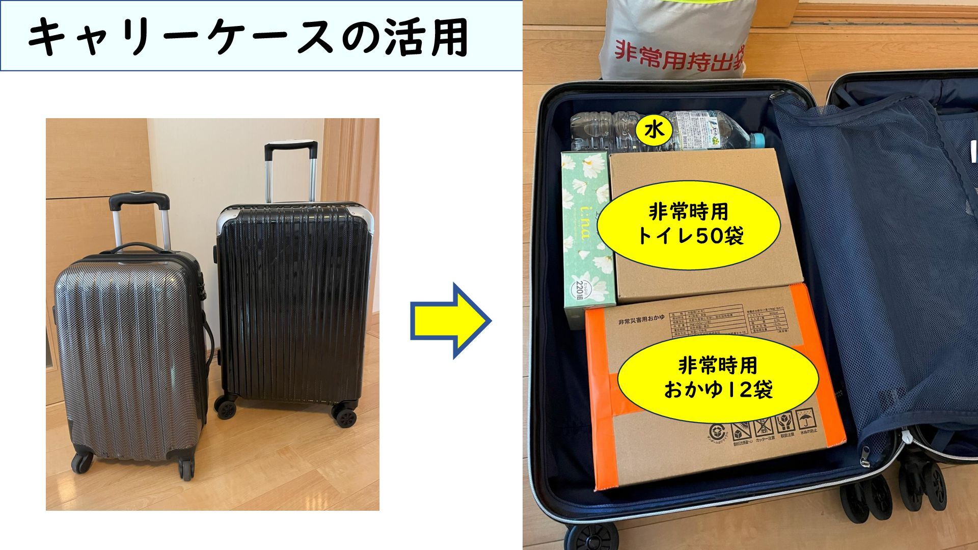 キャリーケースの活用 水 非常時用 トイレ50袋 非常時用 おかゆ12袋