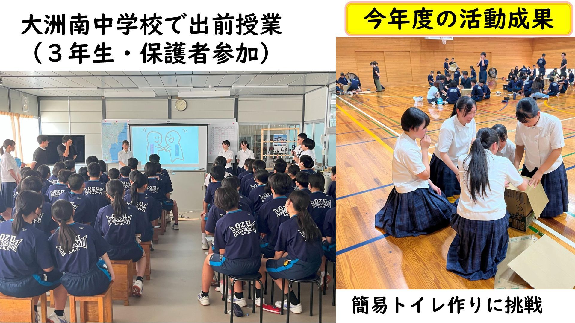 大洲南中学校で出前授業 (3年生・保護者参加) 簡易トイレ作りに挑戦 今年度の活動成果