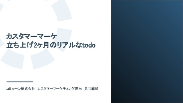 • そもそもコミューンにおけるアドボケイトの定義が決まっていない • そのため計測もできない 重要指標・行動指標の課題を洗い出し、中期(〜1年)で主要指標への効果証明のPDCAが回る状態になる ように3ヶ月単位で目標設計。直近のtodoは12〜2月期の実施を想定 重要指標 • アドボケイトとは何かの定義ができ、定期的に定量・定性での計測ができる状態 • アドボケイトと主要指標(チャーンレート・アップセル)の因果関係の証明ができる・ PDCA が回せる状態 • アドボケイトを増やすための効果的なアクションやキーとなる顧客行動の分析ができて いる状態 直近の todo • 現在アドボケイトと考えられる人の行動・属性の特徴分析 • 特徴分析からブレイクダウンした計測指標の設定 • 第一回目の計測実施、分析 • アドボケイト数