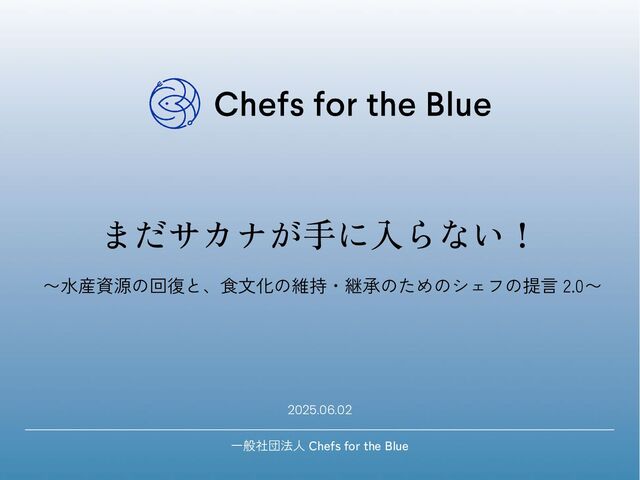 また沿岸魚種に関しては、漁業者による自主的な資源管理の取組内容を定める資源管理協定が2024年に公表 されましたが、協定実施による資源管理への効果がはっきりせず、科学的根拠に基づいた取組と効果の検証 が必要です。 [参考資料10] • さらに近年、価値の高い希少な天然水産物が海外に輸出されることが増えています。国内需要を超えて生産 された養殖水産物を、計画的に海外に輸出することは国内産業の振興にとって重要ですが、限られた資源で ある天然水産物が国内で流通せず、サプライチェーンの上流で相当数が輸出にまわってしまうことは、改正 漁業法の目的(第1条) 「この法律は、漁業が国民に対して水産物を供給する使命を有し…」に沿わず、ま た水産業・小売業・飲食業・旅館業・観光業等多くの産業にとって、振興の阻害要因となり得ます。 3 背景・問題意識(2) 一般社団法人 Chefs for the Blue こうした中で、日本の大切な資産であり資源でもある食文化と、食料安全保障にとって不可欠な 水産資源の回復、そして持続可能な海の確立に向けて、私たちChefs for the Blue(シェフス・ フォー・ザ・ブルー)は次の提言を行います。