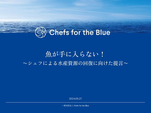 が、資源管理とその前提となる資源調査・評価に必要な人員体制と予算の強化は十分に図られず、 そのために取組が大きく遅れています。 [参考資料6] • また、日本周辺は世界有数の恵まれた漁場であるにも関わらず、漁業が魅力的で持続可能な産業と なっていないことも大きな課題です。 3 こうした中で、日本の食文化と食料安全保障にとって不可欠な水産資源の回復と、持続 可能な海、漁業や流通構造の確立に向けて、私たちChefs for the Blue(シェフス・ フォー・ザ・ブルー)は次の提言を行います。 背景・問題意識(2) 一般社団法人 Chefs for the Blue