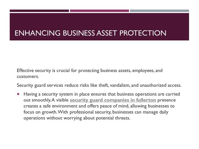business assets, employees, and customers. Security guard services reduce risks like theft, vandalism, and unauthorized access. Having a security system in place ensures that business operations are carried out smoothly. A visible security guard companies in fullerton presence creates a safe environment and offers peace of mind, allowing businesses to focus on growth. With professional security, businesses can manage daily operations without worrying about potential threats.