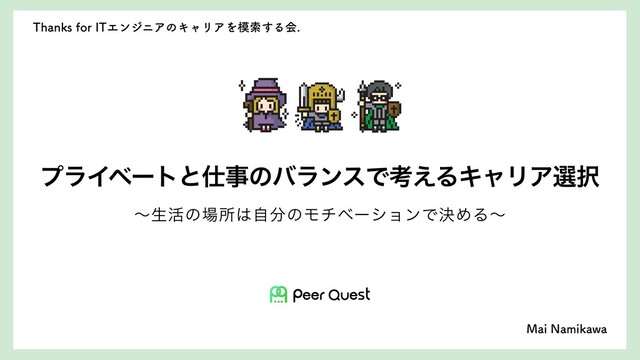 5IBOLTGPS*5ΤϯδχΞͷΩϟϦΞΛࡧ͢Δձ ϓϥΠϕʔτͱࣄͷόϥϯεͰߟ͑ΔΩϟϦΞબ ʙੜ׆ͷॴࣗͷϞνϕʔγϣϯͰܾΊΔʙ .BJ/BNJLBXB