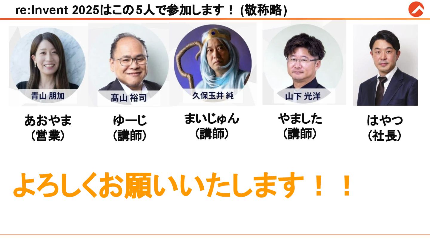 re:Invent 2025はこの5人で参加します! (敬称略) ゆーじ (講師) まいじゅん (講師) あおやま (営業)
