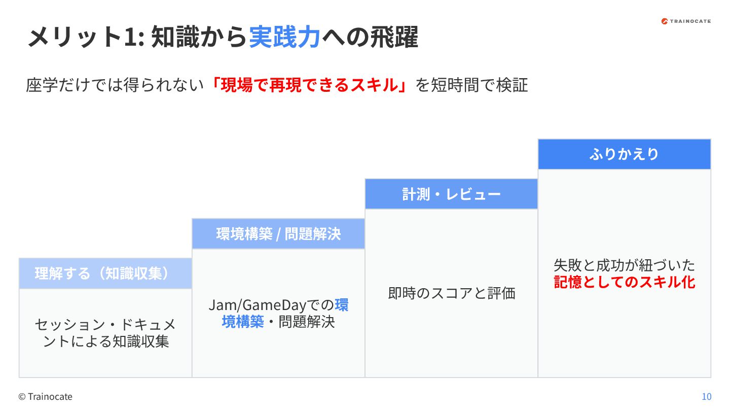 境構築‧問題解決 計測‧レビュー 即時のスコアと評価 ふりかえり 失敗と成功が紐づいた 記憶としてのスキル化 © Trainocate 10