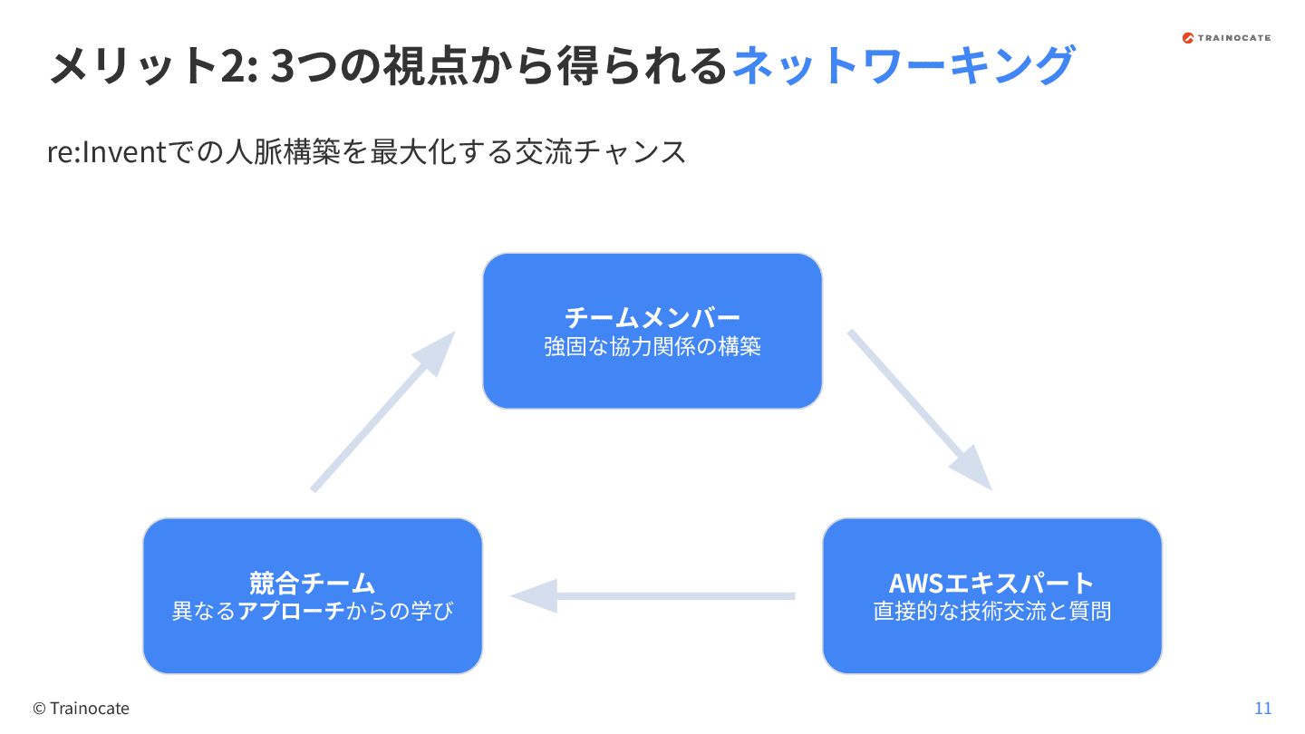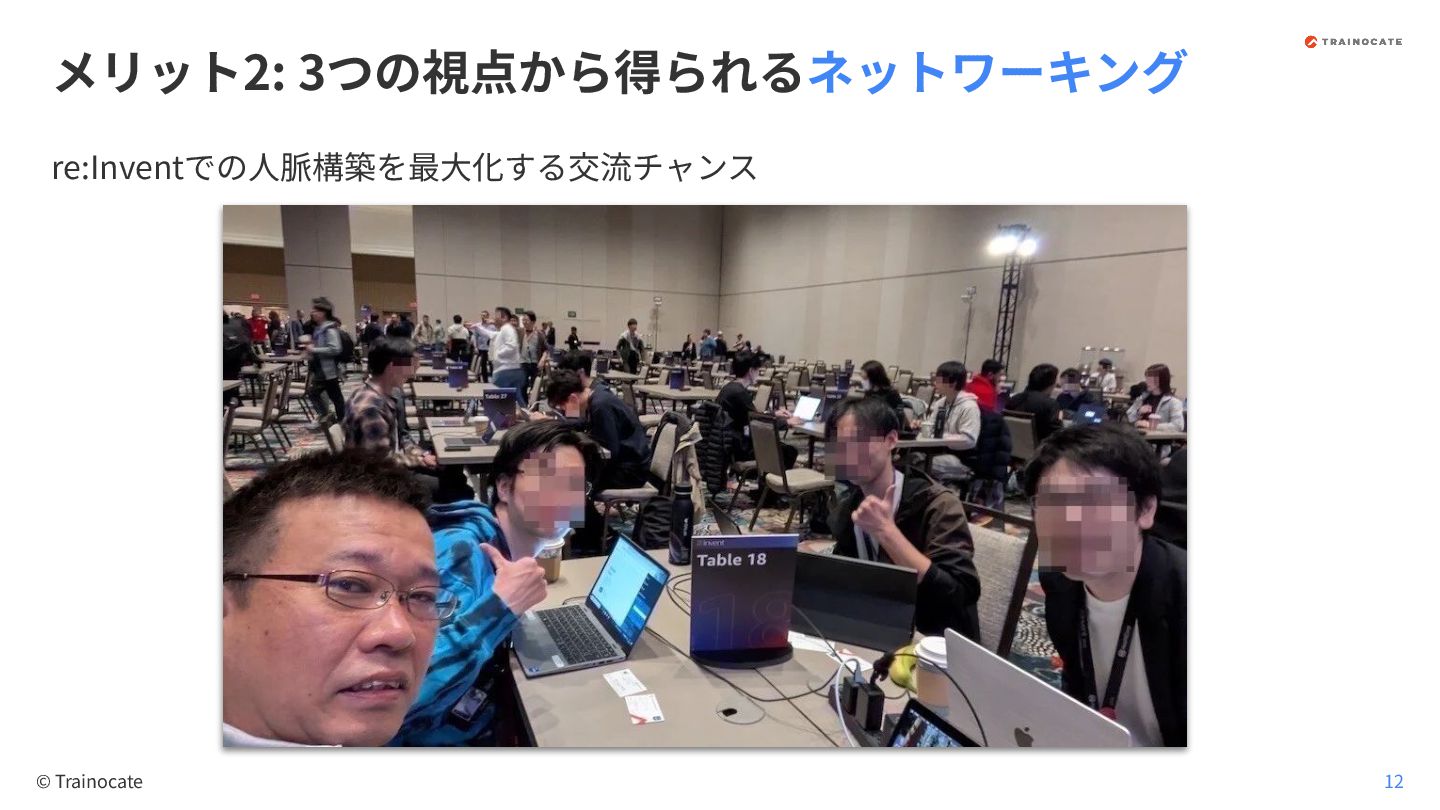 メリット2: 3つの視点から得られるネットワーキング re:Inventでの⼈脈構築を最⼤化する交流チャンス © Trainocate 12